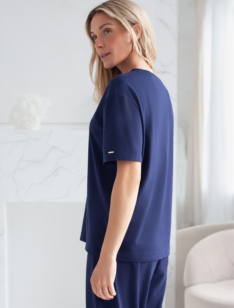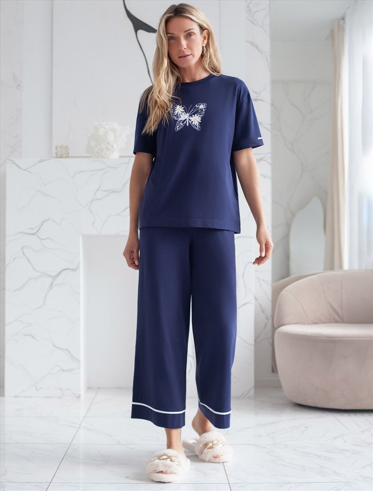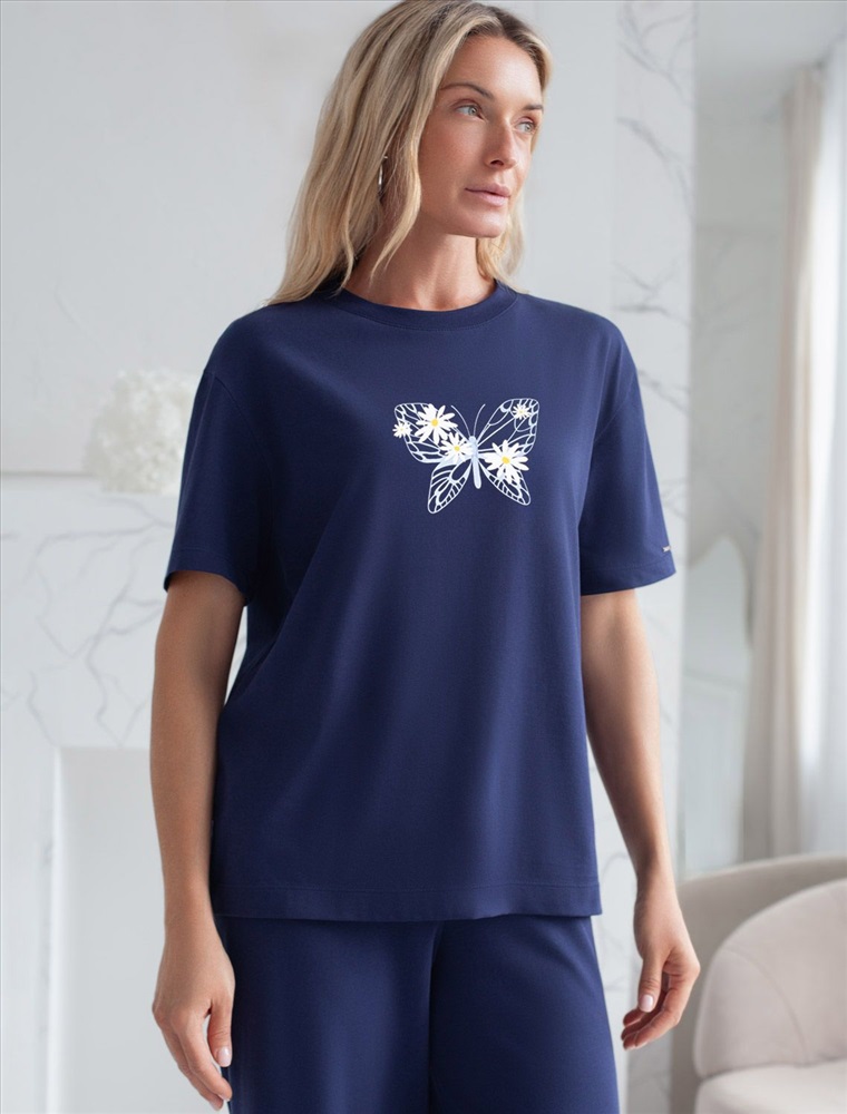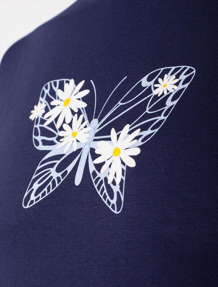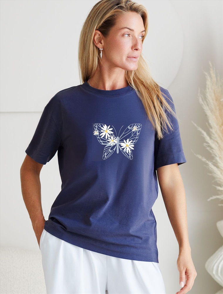 Размер товара на первом фото: 42 Футболка темно-синего цвета изготовлена из премиального хлопка с эластаном, она обеспечивает невероятное ощущение уюта и легкости. Натуральный материал сохраняет форму и цвет после множества стирок, обеспечивая долговечность изделия, а его высокая воздухопроницаемость создает ощущение свежести даже в течение долгого дня. Особое внимание привлекает стильный принт в виде бабочки с цветами. Принт выполнен красками с устойчивым покрытием, который добавляет изделию оригинальности и позволяет выразить индивидуальность. Свободный крой футболки дарит удобство и не стесняет движений, что делает ее идеальной для повседневной носки или активного отдыха, подчеркивает современный взгляд на моду. На рукаве металлический логотип бренда. Подойдет девушкам и женщинам на любую фигуру, вы будете чувствовать себя в ней уверенно и комфортно. Отлично впишется в гардероб благодаря универсальному дизайну, который легко сочетать с джинсами, шортами или спортивными брюками.