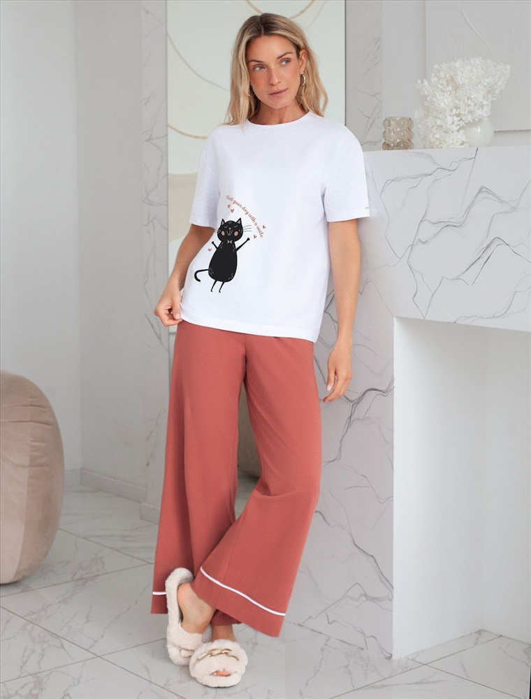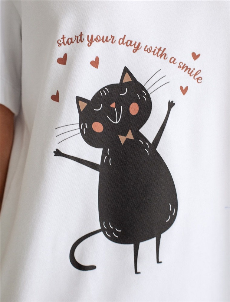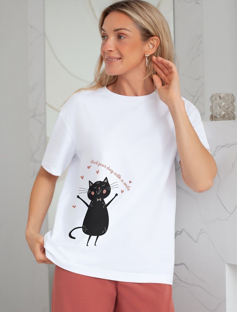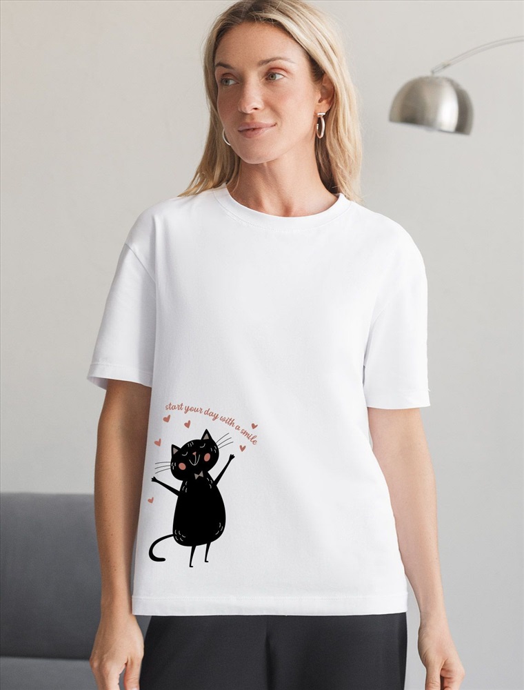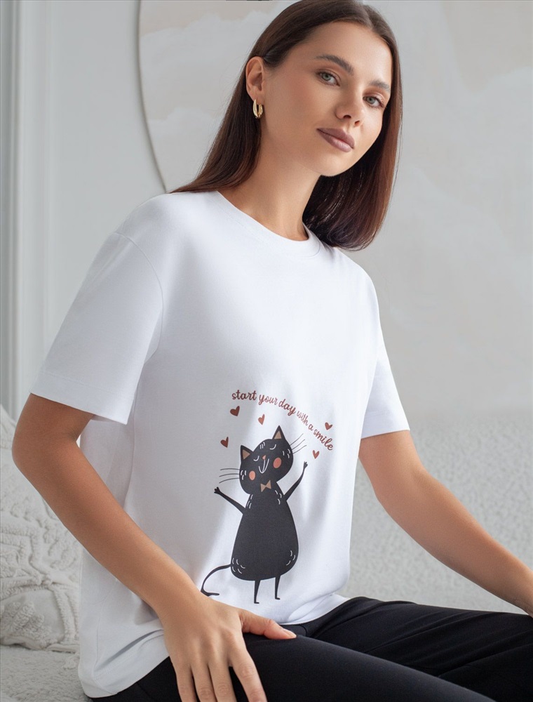 Плотность: 170 Г/м2 Размер товара на первом фото: 42 Футболка белого цвета изготовлена из премиального хлопка с эластаном, она обеспечивает невероятное ощущение уюта и легкости. Натуральный материал сохраняет форму и цвет после множества стирок, обеспечивая долговечность изделия, а его высокая воздухопроницаемость создает ощущение свежести даже в течение долгого дня. Особое внимание привлекает стильный принт в виде кота и сердечек с минималистичной надписью. Перевод надписи Start your day with a smile - Начни свой день с улыбки. Принт выполненны красками с устойчивым покрытием, который добавляет изделию оригинальности и позволяет выразить индивидуальность. Свободный крой футболки дарит удобство и не стесняет движений, что делает ее идеальной для повседневной носки или активного отдыха, подчеркивает современный взгляд на моду. На рукаве металлический логотип бренда. Подойдет девушкам и женщинам на любую фигуру, вы будете чувствовать себя в ней уверенно и комфортно. Отлично впишется в гардероб благодаря универсальному дизайну, который легко сочетать с джинсами, шортами или спортивными брюками. Комментарии к товару