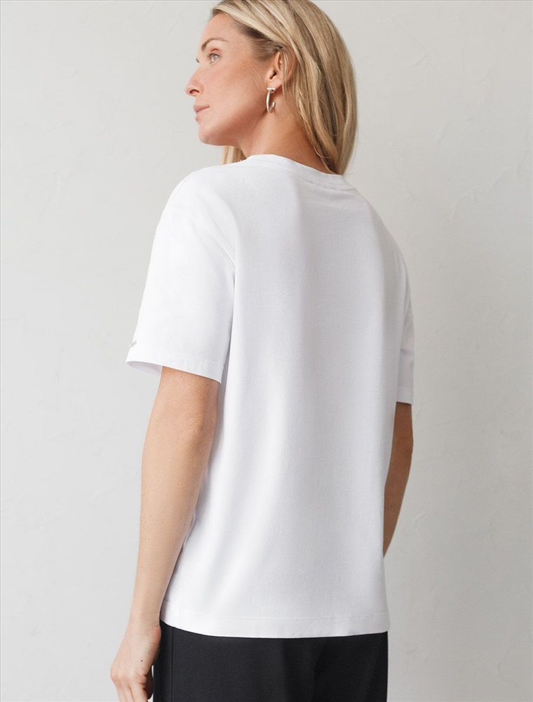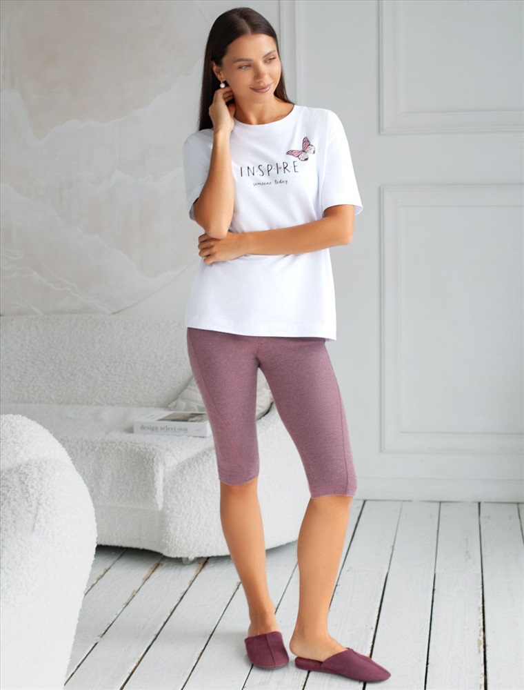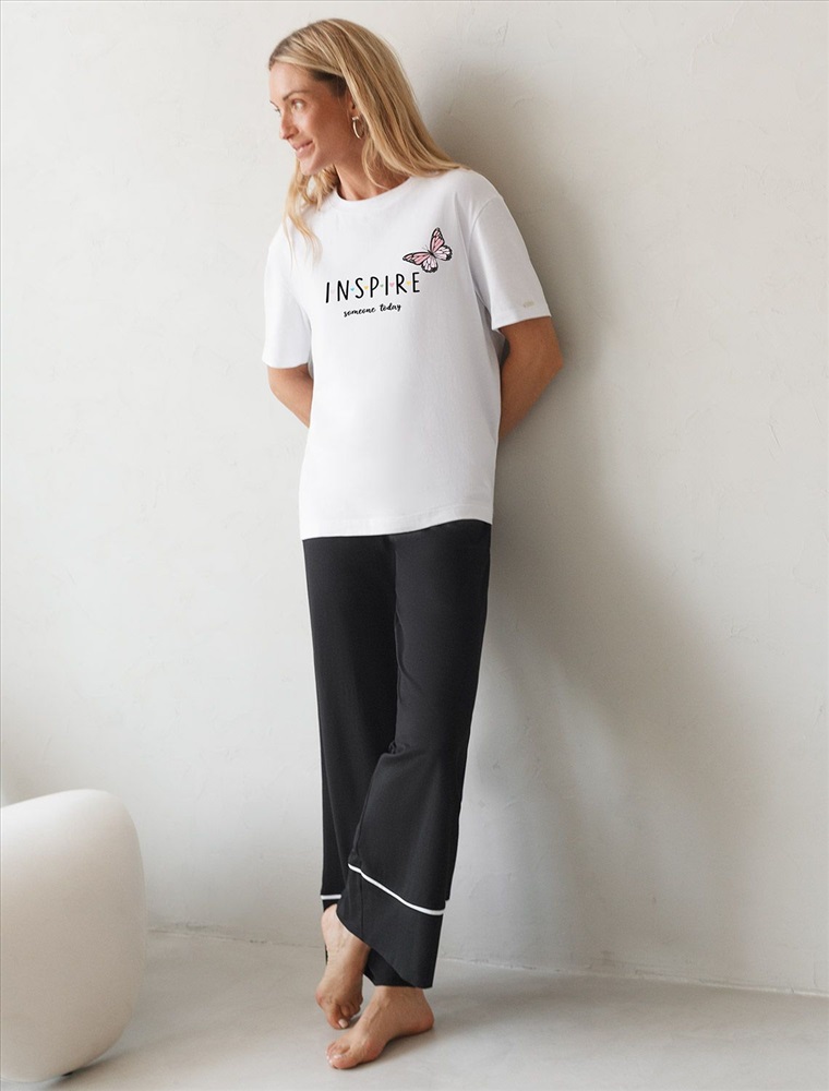 Размер товара на первом фото: 42 Футболка белого цвета изготовлена из премиального хлопка с эластаном, она обеспечивает невероятное ощущение уюта и легкости. Натуральный материал сохраняет форму и цвет после множества стирок, обеспечивая долговечность изделия, а его высокая воздухопроницаемость создает ощущение свежести даже в течение долгого дня. Особое внимание привлекает стильный принт в виде бабочки с минималистичной надписью, перевод надписи Inspire Someone Today - Вдохновите кого-нибудь сегодня . Принт выполненны красками с устойчивым покрытием, который добавляет изделию оригинальности и позволяет выразить индивидуальность. Свободный крой футболки дарит удобство и не стесняет движений, что делает ее идеальной для повседневной носки или активного отдыха, подчеркивает современный взгляд на моду. На рукаве металлический логотип бренда. Подойдет девушкам и женщинам на любую фигуру, вы будете чувствовать себя в ней уверенно и комфортно. Отлично впишется в гардероб благодаря универсальному дизайну, который легко сочетать с джинсами, шортами или спортивными брюками.