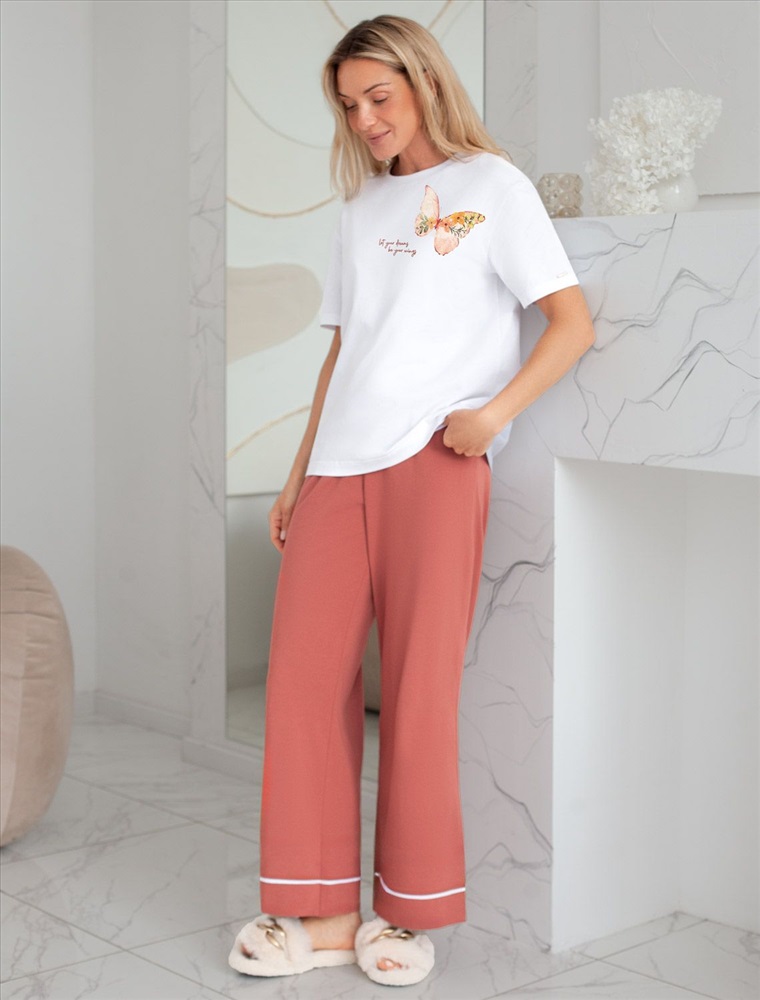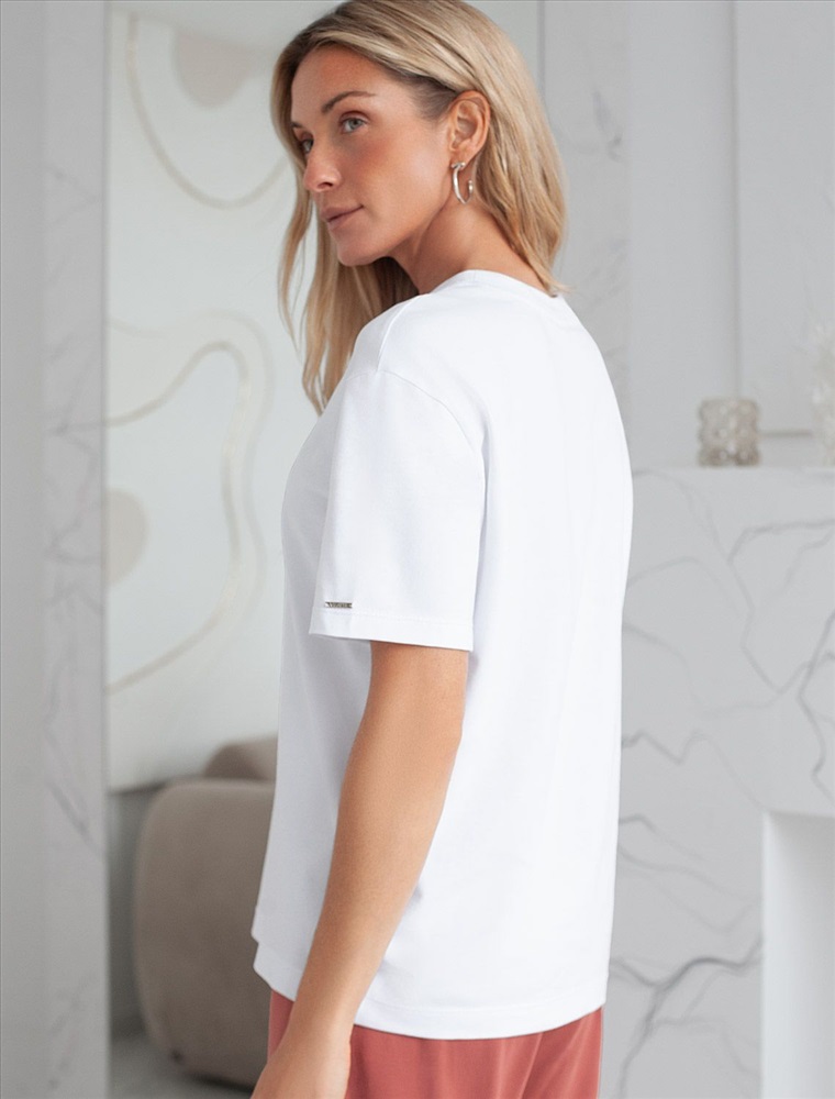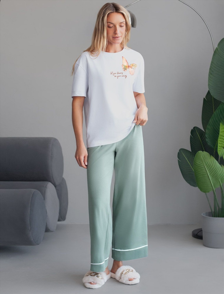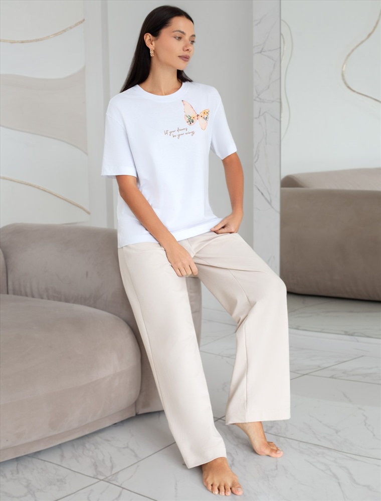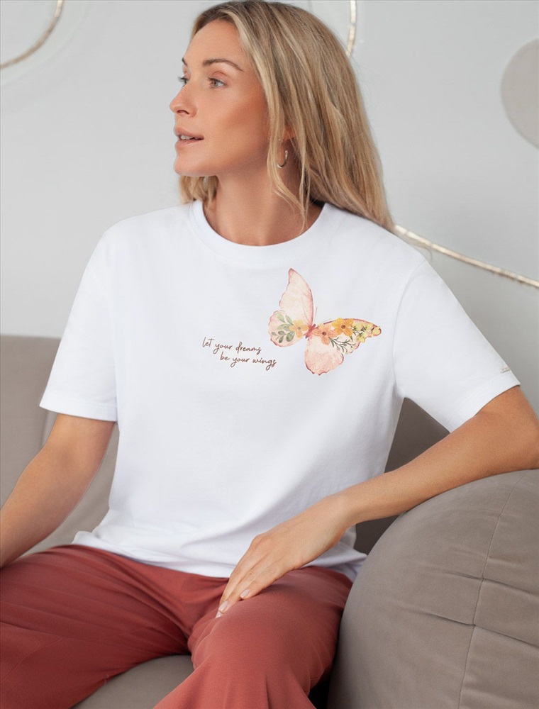 Плотность: 170 Г/м2 Размер товара на первом фото: 42 Футболка белого цвета изготовлена из премиального хлопка с эластаном, она обеспечивает невероятное ощущение уюта и легкости. Натуральный материал сохраняет форму и цвет после множества стирок, обеспечивая долговечность изделия, а его высокая воздухопроницаемость создает ощущение свежести даже в течение долгого дня. Особое внимание привлекает стильный принт в виде бабочки с минималистичной надписью. Перевод надписи Let your dreams be your wings - Пусть твои мечты станут твоими крыльями. Принт выполнен красками с устойчивым покрытием, который добавляет изделию оригинальности и позволяет выразить индивидуальность. Свободный крой футболки дарит удобство и не стесняет движений, что делает ее идеальной для повседневной носки или активного отдыха, подчеркивает современный взгляд на моду. На рукаве металлический логотип бренда. Подойдет девушкам и женщинам на любую фигуру, вы будете чувствовать себя в ней уверенно и комфортно. Отлично впишется в гардероб благодаря универсальному дизайну, который легко сочетать с джинсами, шортами или спортивными брюками. Комментарии к товару