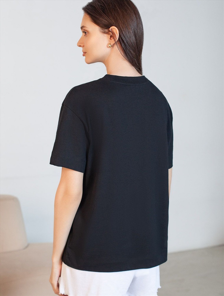 Плотность: 140 Г/м2 Футболка черного цвета выполнена из премиального 100% хлопка плотностью 140 Г/м2. Главная особенность этого изделия — тонкое кулирное полотно, которое легче и воздушнее стандартного варианта. Благодаря своей деликатной текстуре футболка идеально подходит для домашних образов и пижамных комплектов. Ткань отлично дышит, обеспечивая максимальный уют во время сна и отдыха. Особое внимание привлекает стильный принт контрастного цвета в виде сердца с надписью. Принт выполнен красками с устойчивым покрытием, который добавляет изделию оригинальности и позволяет выразить индивидуальность. Перевод надписи: Улыбайся, будь позитивной. Верь в себя, люби. Свободный крой футболки дарит удобство и не стесняет движений, что делает ее идеальной для повседневной носки или активного отдыха, подчеркивает современный взгляд на моду. Подойдет девушкам и женщинам на любую фигуру, вы будете чувствовать себя в ней уверенно и комфортно. Лаконичный современный принт делает изделие универсальным: можно создавать стильные образы для прогулок, встреч, занятий спортом и домашних дел. Базовая футболка подходит для любой ситуации и сочетается с разными элементами гардероба. Рекомендуем сочетать с артикулами: D44.163, D44.162, D44.161, D46.058, D48.011, D48.012 Комментарии к товару