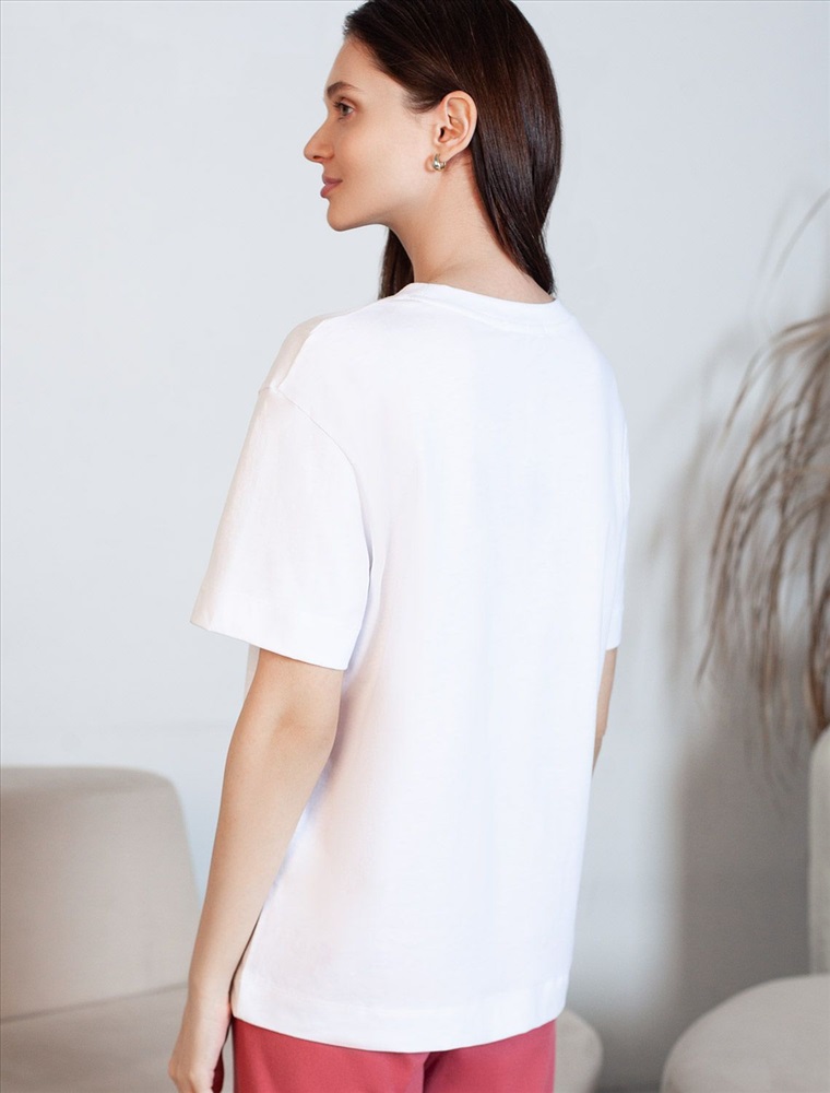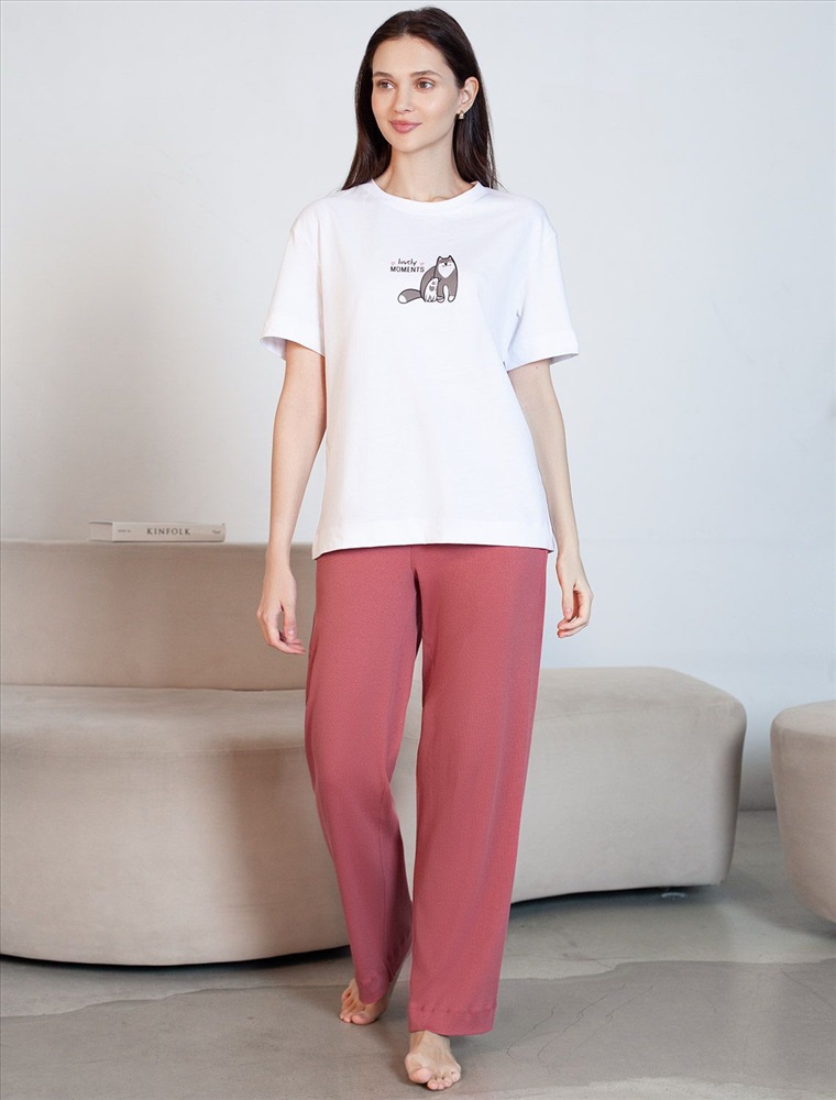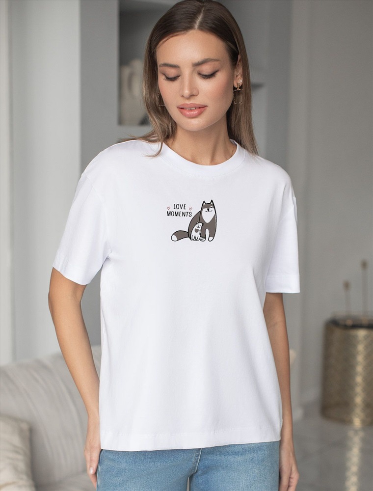 Плотность: 140 Г/м2 Футболка белого цвета выполнена из премиального 100% хлопка плотностью 140 Г/м2. Главная особенность этого изделия — тонкое кулирное полотно, которое легче и воздушнее стандартного варианта. Благодаря своей деликатной текстуре футболка идеально подходит для домашних образов и пижамных комплектов. Ткань отлично дышит, обеспечивая максимальный уют во время сна и отдыха. Особое внимание привлекает стильный принт контрастного цвета в виде котиков с надписью. Перевод надписи: Love moments - Моменты любви. Принт выполнен красками с устойчивым покрытием, который добавляет изделию оригинальности и позволяет выразить индивидуальность. Свободный крой футболки дарит удобство и не стесняет движений, что делает ее идеальной для повседневной носки или активного отдыха, подчеркивает современный взгляд на моду. Подойдет девушкам и женщинам на любую фигуру, вы будете чувствовать себя в ней уверенно и комфортно. Лаконичный современный принт делает изделие универсальным: можно создавать стильные образы для прогулок, встреч, занятий спортом и домашних дел. Базовая футболка подходит для любой ситуации и сочетается с разными элементами гардероба. Рекомендуем сочетать с артикулами: D44.163, D44.162, D44.161, D46.058, D48.011, D48.012 Комментарии к товару