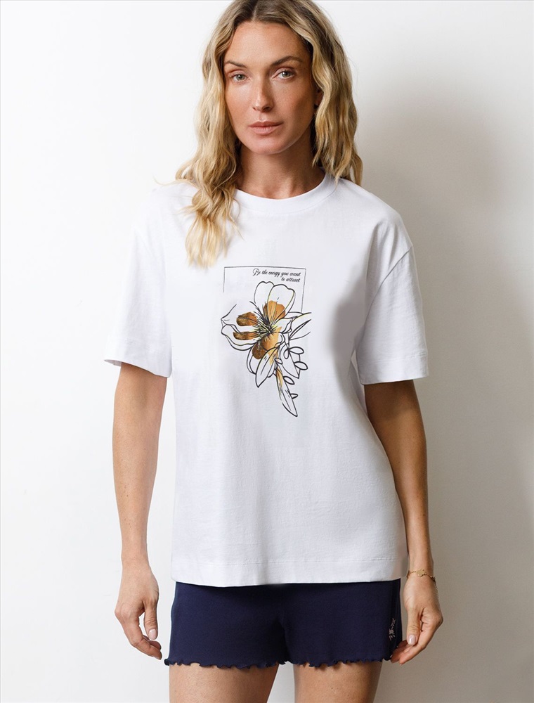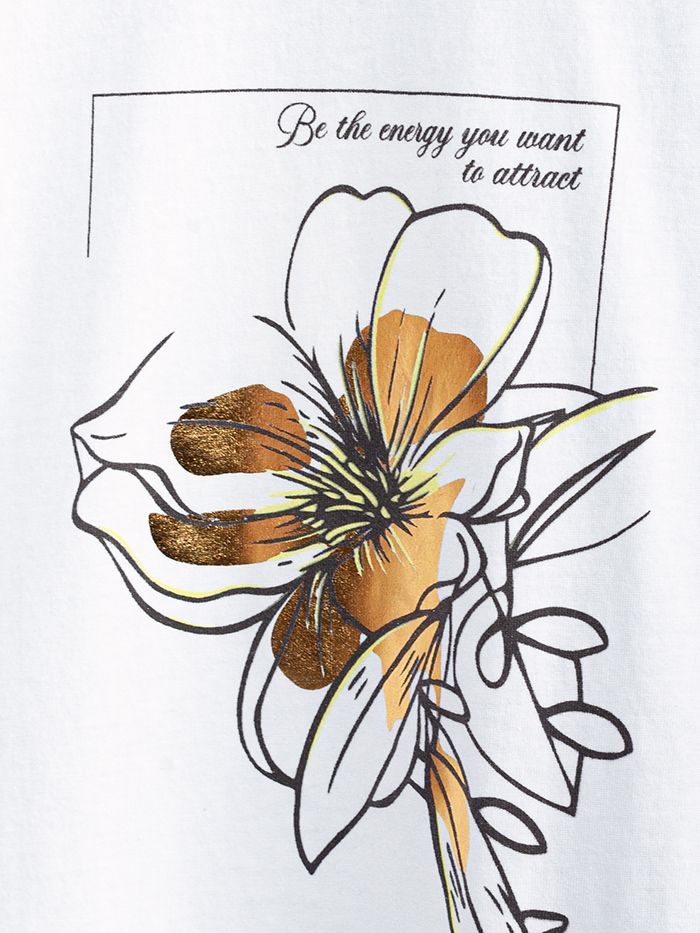 Плотность: 140 Г/м2 Футболка белого цвета выполнена из премиального 100% хлопка плотностью 140 Г/м2. Главная особенность этого изделия — тонкое кулирное полотно, которое легче и воздушнее стандартного варианта. Благодаря своей деликатной текстуре футболка идеально подходит для домашних образов и пижамных комплектов. Ткань отлично дышит, обеспечивая максимальный уют во время сна и отдыха. Особое внимание привлекает стильный принт контрастного цвета в виде цветка с надписью. Перевод надписи: Be the energy you vant to attract - Будь той энергией, которую хочешь привлечь. Принт выполнен красками с устойчивым покрытием, который добавляет изделию оригинальности и позволяет выразить индивидуальность. Свободный крой футболки дарит удобство и не стесняет движений, что делает ее идеальной для повседневной носки или активного отдыха, подчеркивает современный взгляд на моду. Подойдет девушкам и женщинам на любую фигуру, вы будете чувствовать себя в ней уверенно и комфортно. Лаконичный современный принт делает изделие универсальным: можно создавать стильные образы для прогулок, встреч, занятий спортом и домашних дел. Базовая футболка подходит для любой ситуации и сочетается с разными элементами гардероба. Рекомендуем сочетать с артикулами: D44.163, D44.162, D44.161, D46.058, D48.011, D48.012 Комментарии к товару