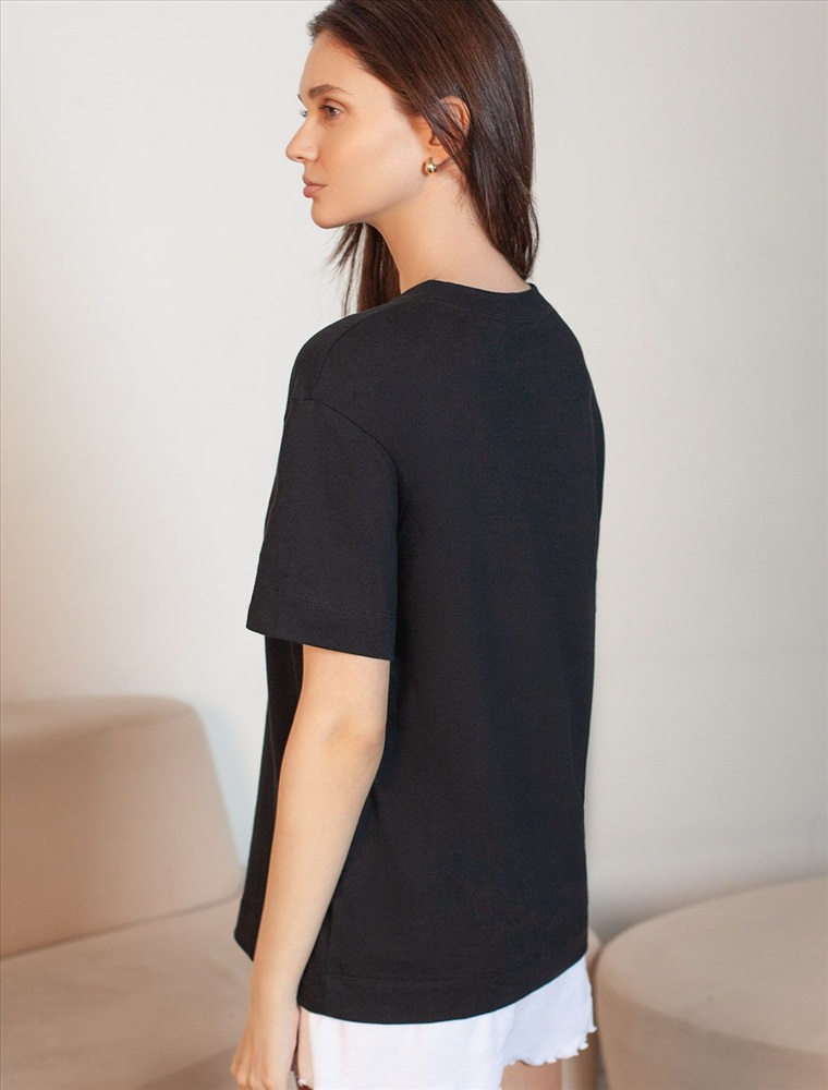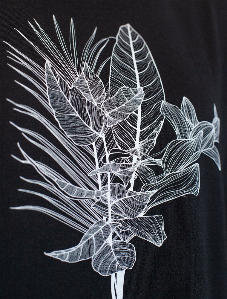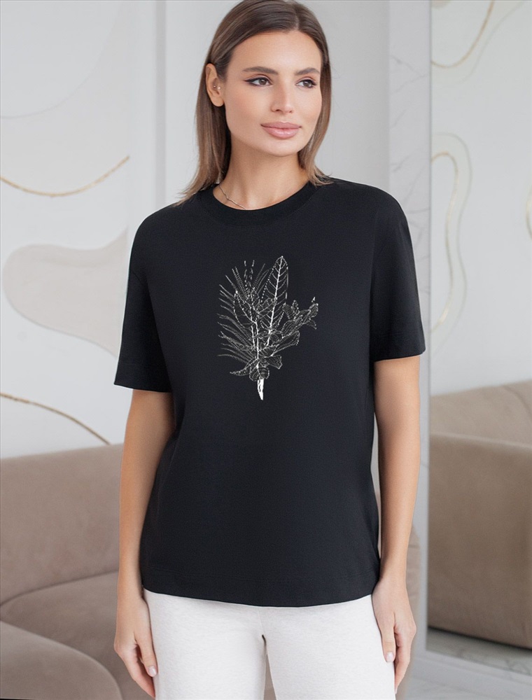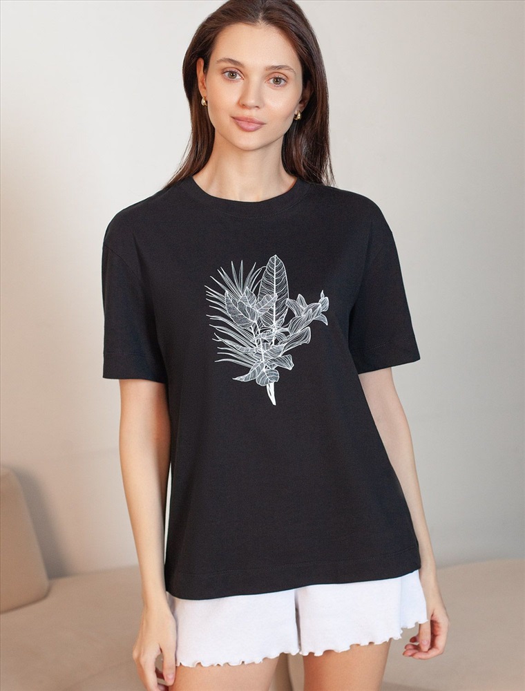 Плотность: 140 Г/м2 Футболка черного цвета выполнена из премиального 100% хлопка плотностью 140 Г/м2. Главная особенность этого изделия — тонкое кулирное полотно, которое легче и воздушнее стандартного варианта. Благодаря своей деликатной текстуре футболка идеально подходит для домашних образов и пижамных комплектов. Ткань отлично дышит, обеспечивая максимальный уют во время сна и отдыха. Особое внимание привлекает стильный принт контрастного цвета в виде тропических растений. Принт выполнен красками с устойчивым покрытием, который добавляет изделию оригинальности и позволяет выразить индивидуальность. Свободный крой футболки дарит удобство и не стесняет движений, что делает ее идеальной для повседневной носки или активного отдыха, подчеркивает современный взгляд на моду. Подойдет девушкам и женщинам на любую фигуру, вы будете чувствовать себя в ней уверенно и комфортно. Лаконичный современный принт делает изделие универсальным: можно создавать стильные образы для прогулок, встреч, занятий спортом и домашних дел. Базовая футболка подходит для любой ситуации и сочетается с разными элементами гардероба. Рекомендуем сочетать с артикулами: D44.163, D44.162, D44.161, D46.058, D48.011, D48.012 Комментарии к товару