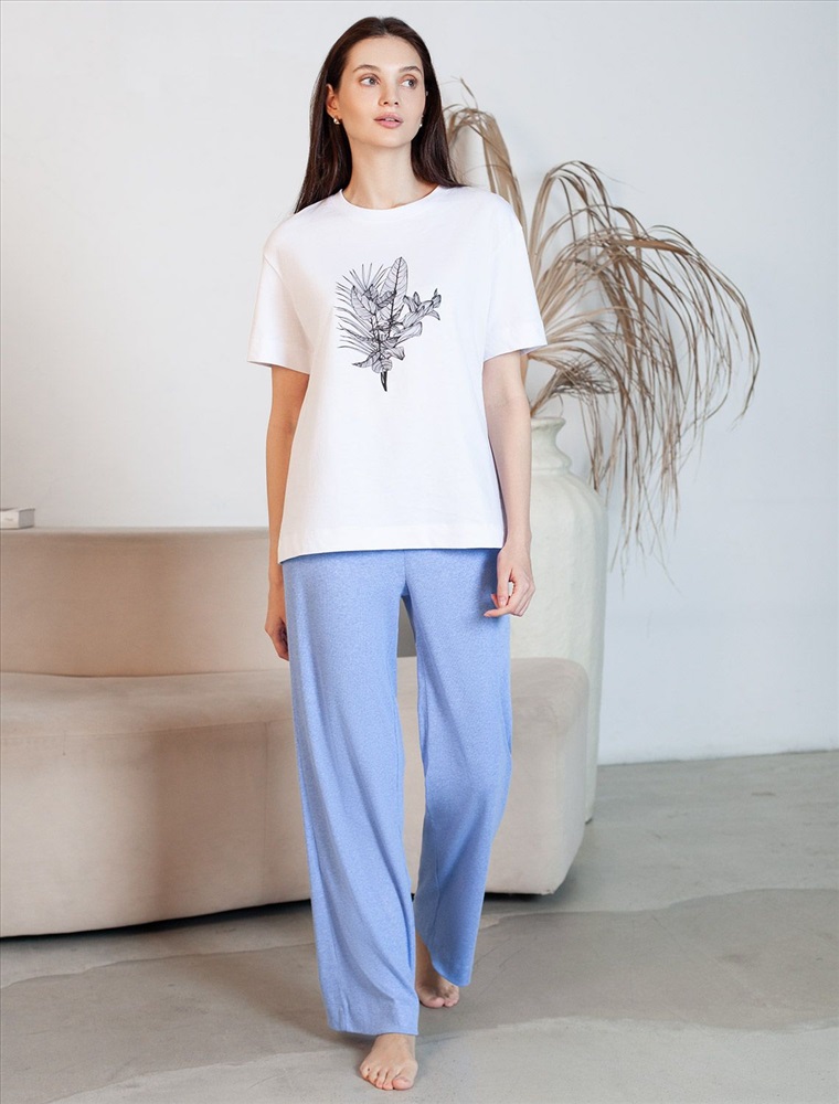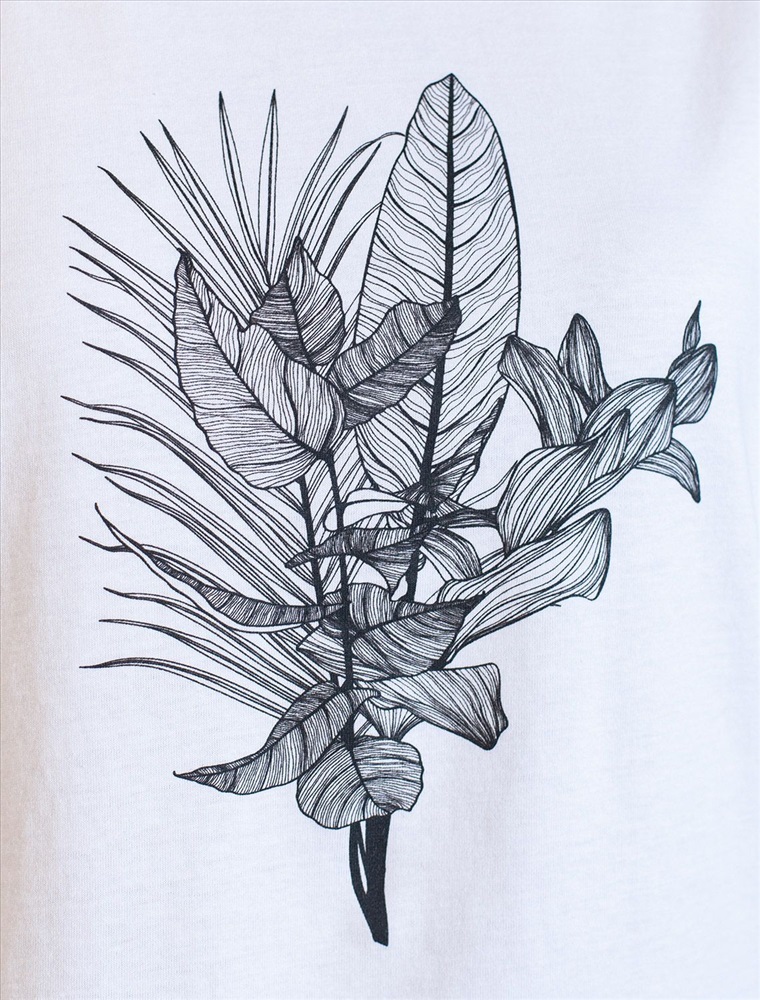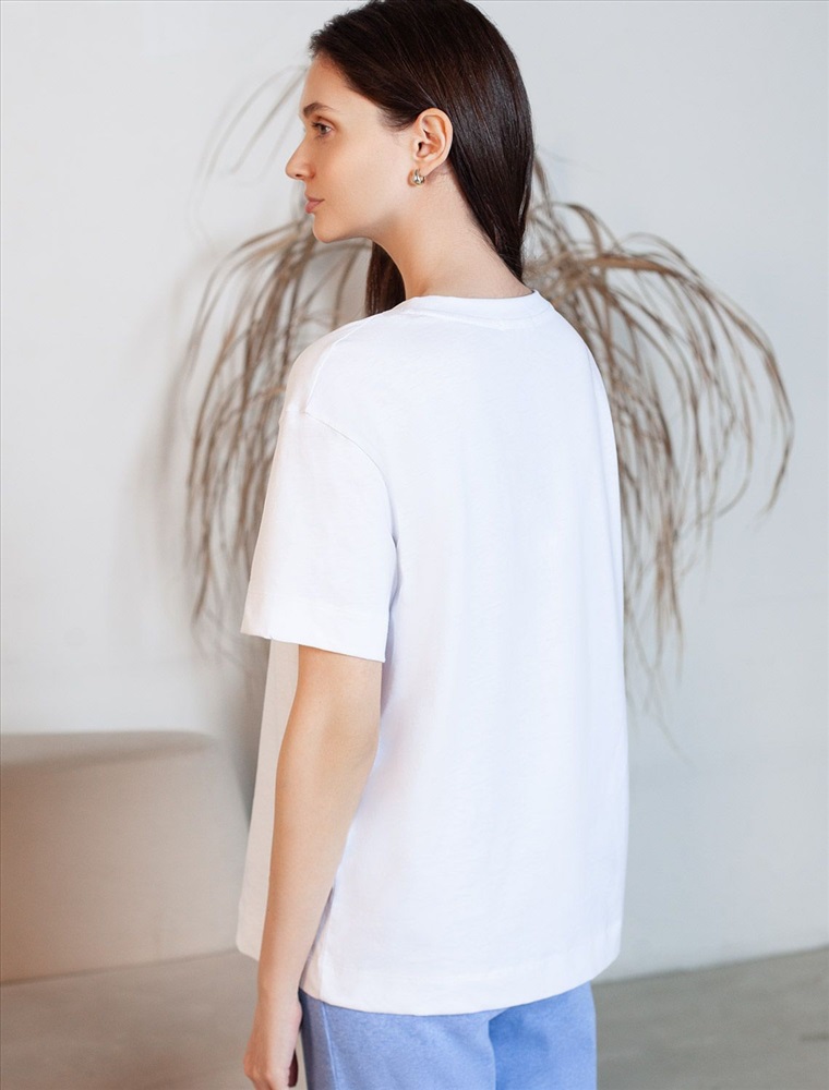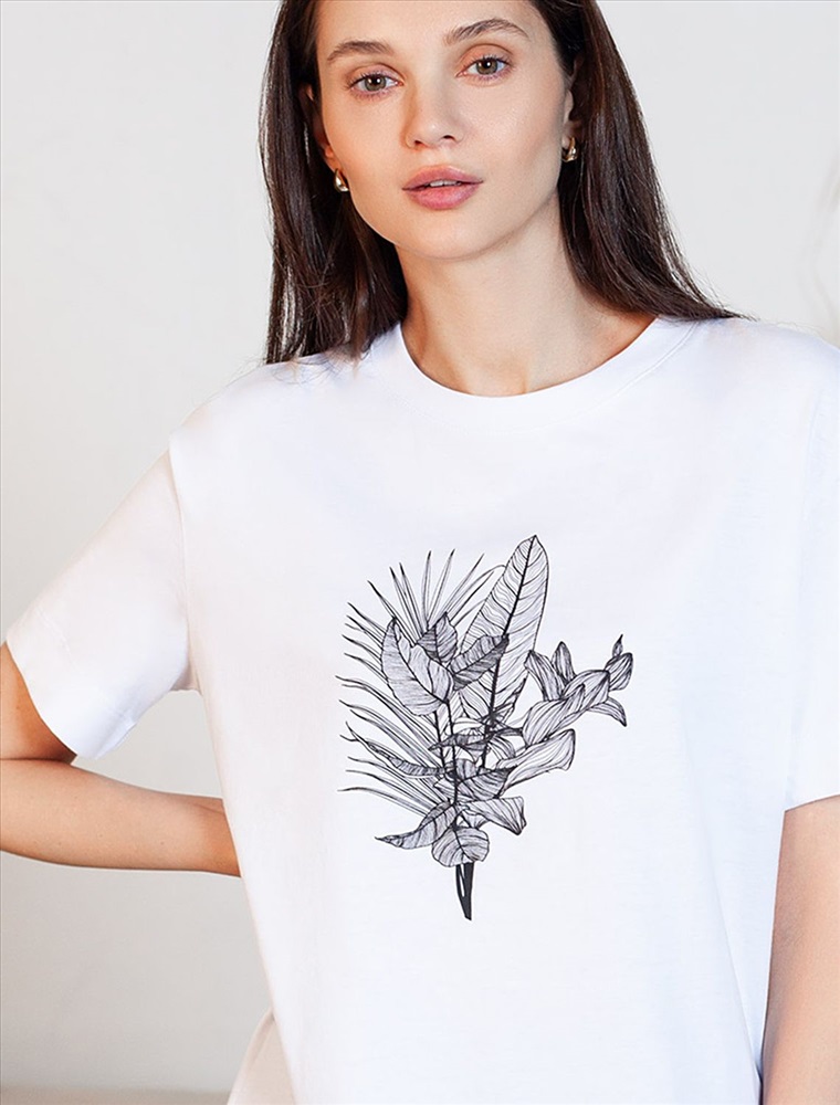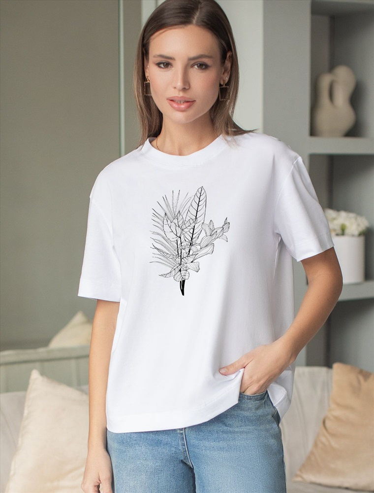 Плотность: 140 Г/м2 Футболка белого цвета выполнена из премиального 100% хлопка плотностью 140 Г/м2. Главная особенность этого изделия — тонкое кулирное полотно, которое легче и воздушнее стандартного варианта. Благодаря своей деликатной текстуре футболка идеально подходит для домашних образов и пижамных комплектов. Ткань отлично дышит, обеспечивая максимальный уют во время сна и отдыха. Особое внимание привлекает стильный принт контрастного цвета в виде тропических растений. Принт выполнен красками с устойчивым покрытием, который добавляет изделию оригинальности и позволяет выразить индивидуальность. Свободный крой футболки дарит удобство и не стесняет движений, что делает ее идеальной для повседневной носки или активного отдыха, подчеркивает современный взгляд на моду. Подойдет девушкам и женщинам на любую фигуру, вы будете чувствовать себя в ней уверенно и комфортно. Лаконичный современный принт делает изделие универсальным: можно создавать стильные образы для прогулок, встреч, занятий спортом и домашних дел. Базовая футболка подходит для любой ситуации и сочетается с разными элементами гардероба. Рекомендуем сочетать с артикулами: D44.163, D44.162, D44.161, D46.058, D48.011, D48.012 Комментарии к товару