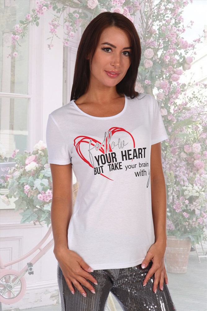 Стиль: молодежный | повседневный Футболка из кулирки полуприлегающего силуэта, с округлой горловиной, длиной до середины бедра. Рукав втачной короткий. Горловина обработана бейкой из основного полотна