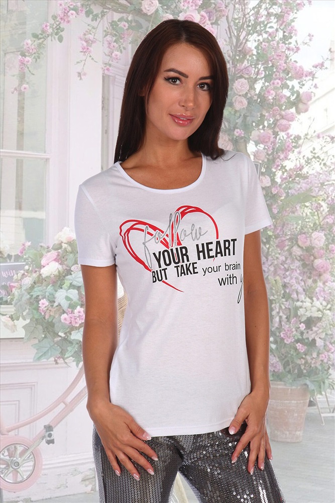 ID товара: 275152 Состав: Хлопок 100% Сезон: Весна/Лето Длина: Средняя Фасон: Прямой Рукав: Короткий Вид застежки: Нет Вырез горловины: Круглый Рисунок: Надпись Тип карманов: Без карманов Декоративные элементы: Печатный принт Основная ткань: Хлопок | Кулирка, Кулирка — это самое тонкое и гладкое трикотажное полотно, изготовленное из чистого хлопка. Полотно имеет характерную структуру- с лицевой стороны плоские «косички», с изнаночной – «кирпичная кладка». Особенности- гигроскопична, воздухопроницаема, при стирке, сушке и глажке не садится, хорошо держит форму, не образует складки. Стиль: Повседневный Страна бренда: Россия Страна производства: Россия Футболка из кулирки полуприлегающего силуэта, с округлой горловиной, длиной до середины бедра. Рукав втачной короткий. Горловина обработана бейкой из основного полотна. Комментарии к товару