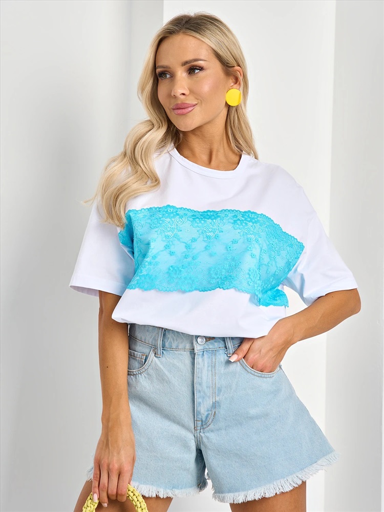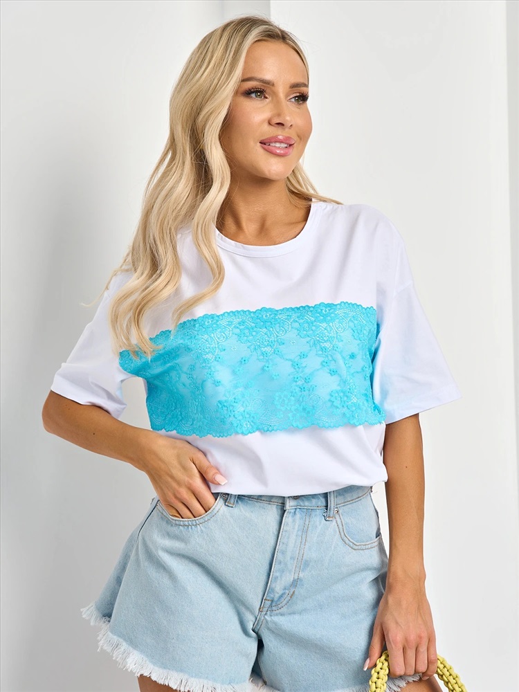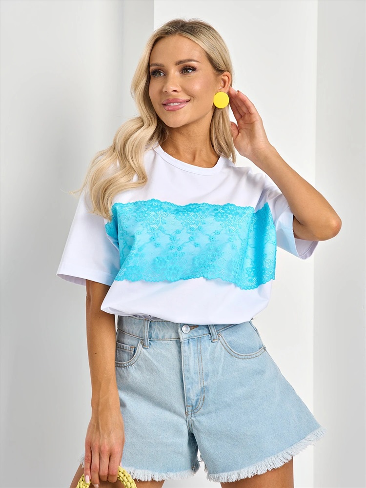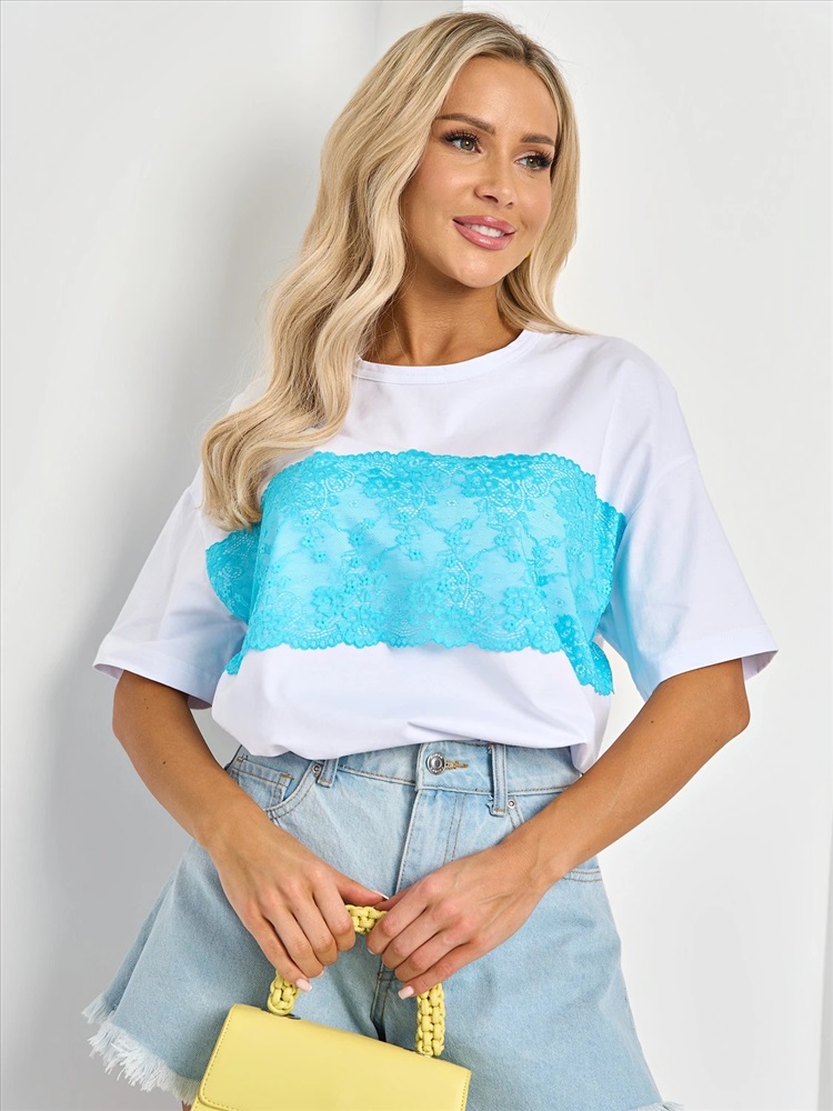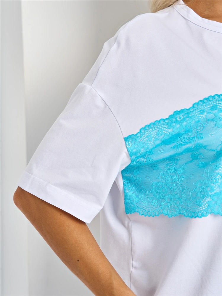 Перед изделия декорирован голубым кружевом.