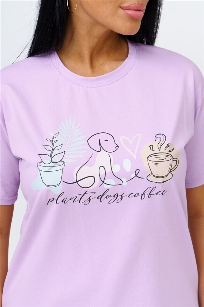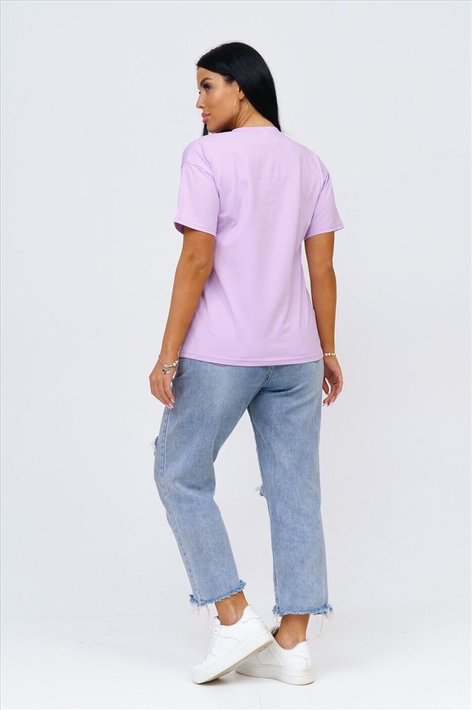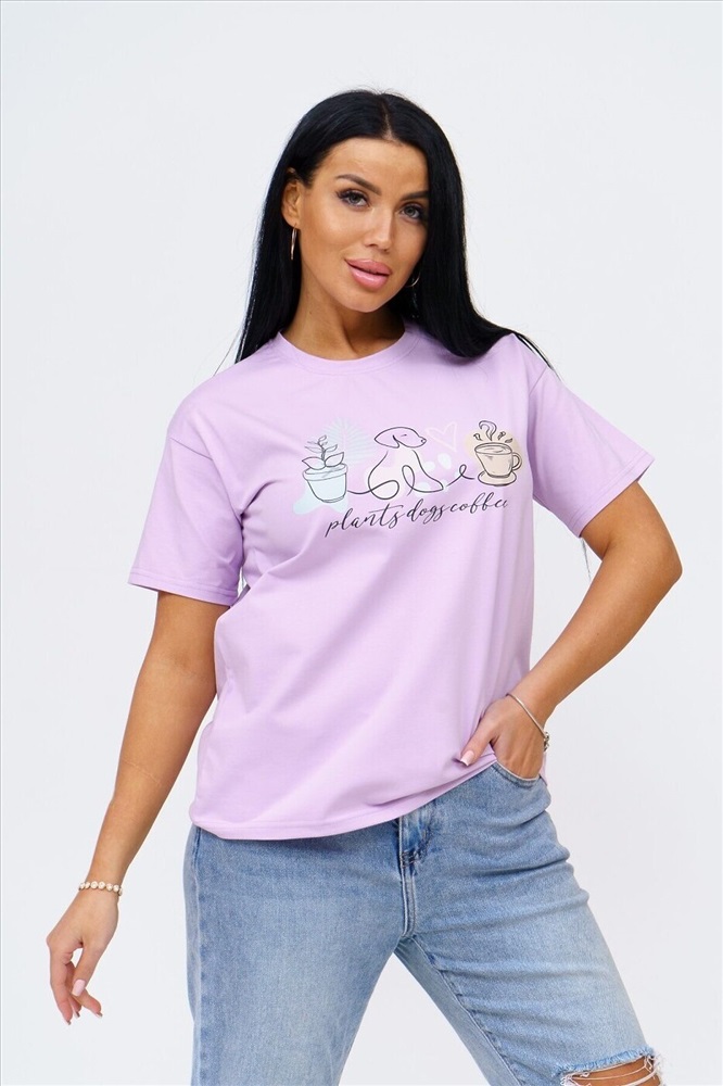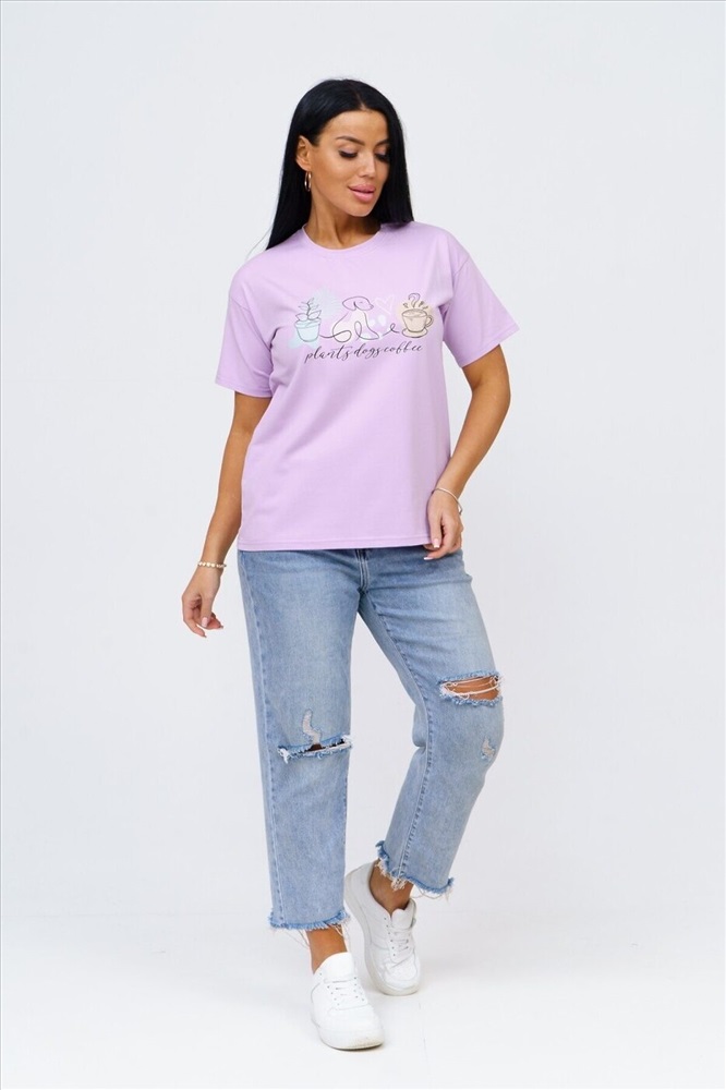 Страна производства: Россия Футболка женская прямого силуэта, длиной до середины бедра. Рукав втачной, короткий. Горловина округлой формы. На полочку футболки нанесен принт.