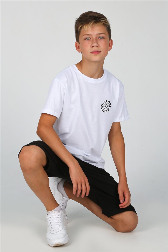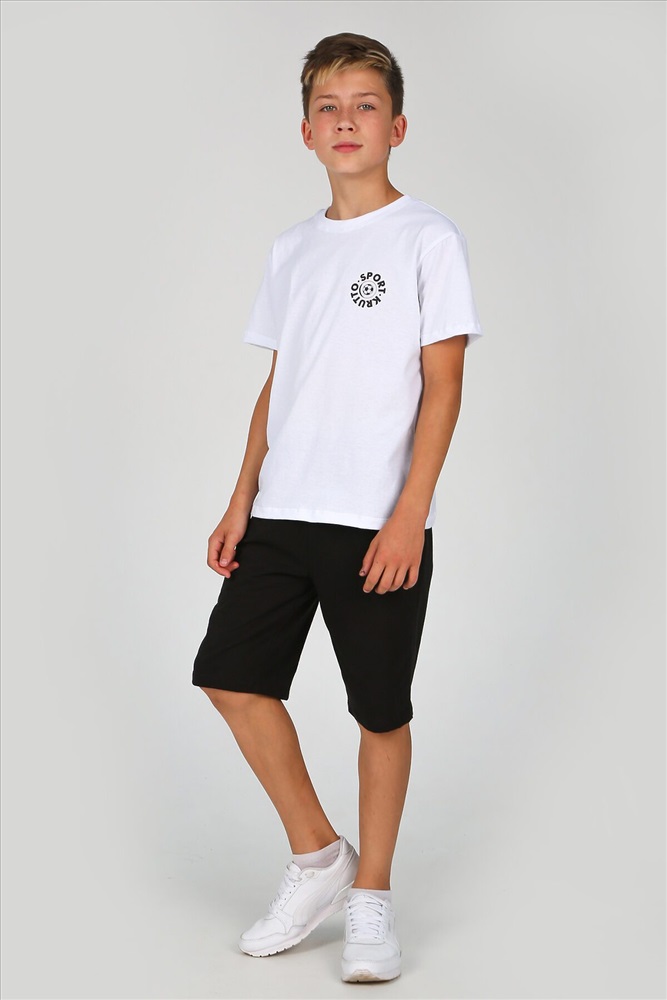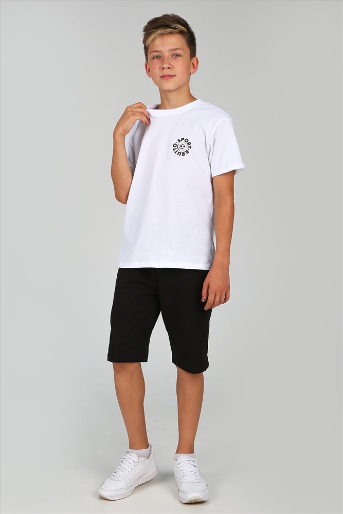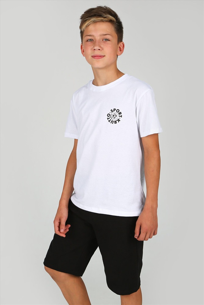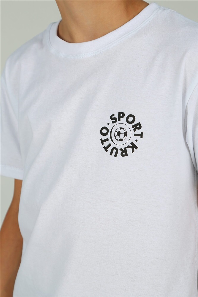 Страна производства: Россия Футболка для мальчика с принтом на полочке, выполнена из хлопкового трикотажа. Прямой свободный крой, круглый вырез горловины, короткие рукава с заниженной линией плеча.