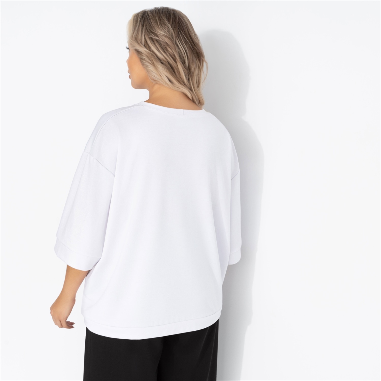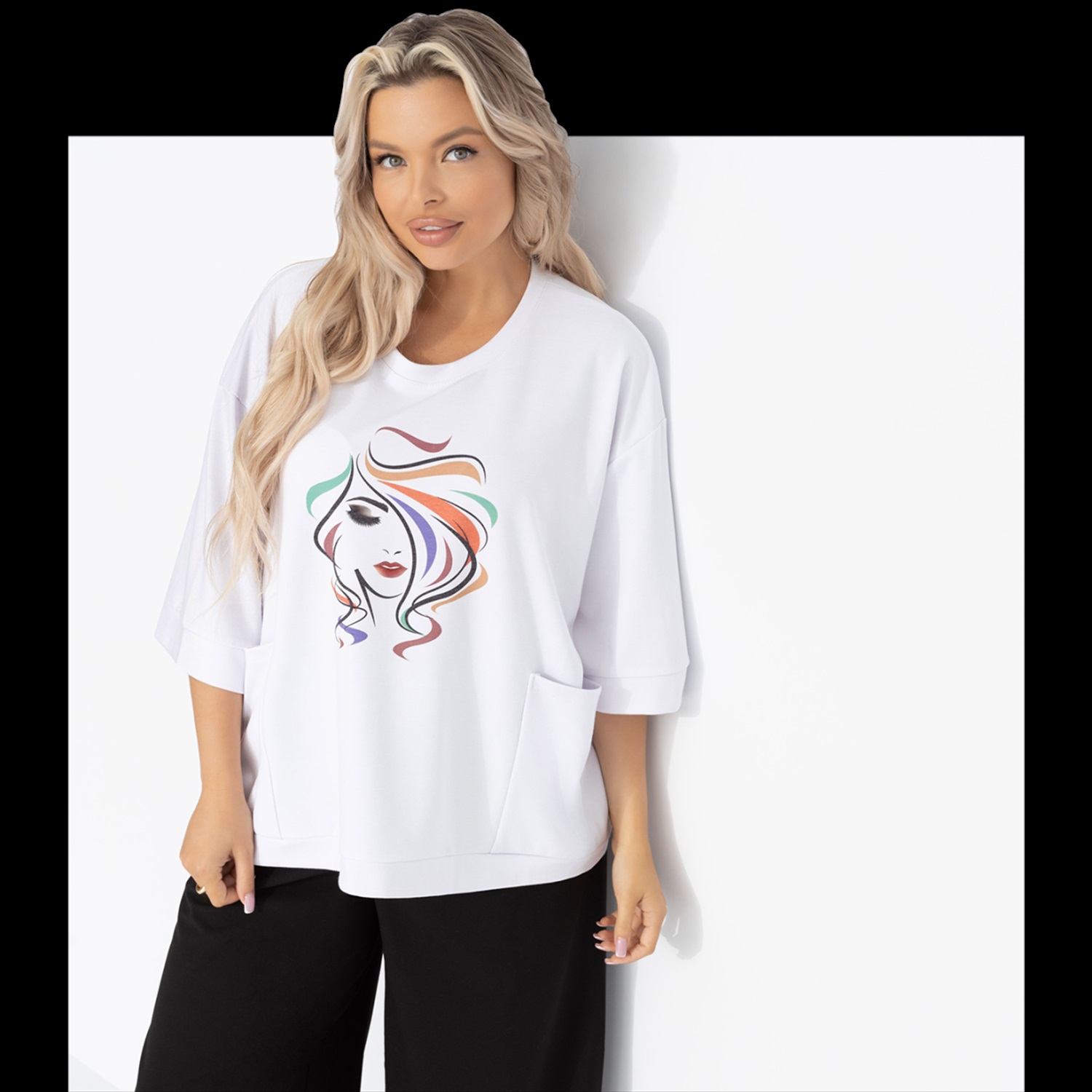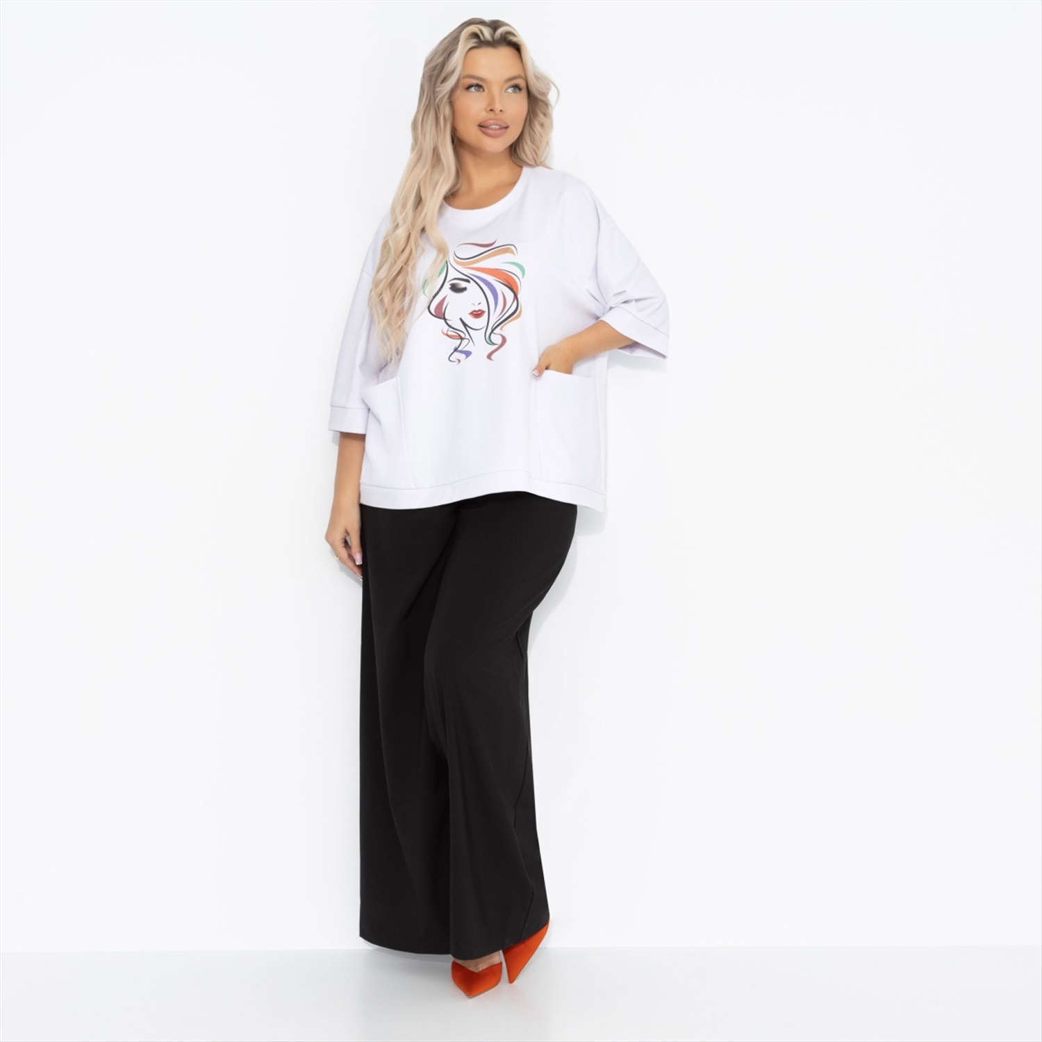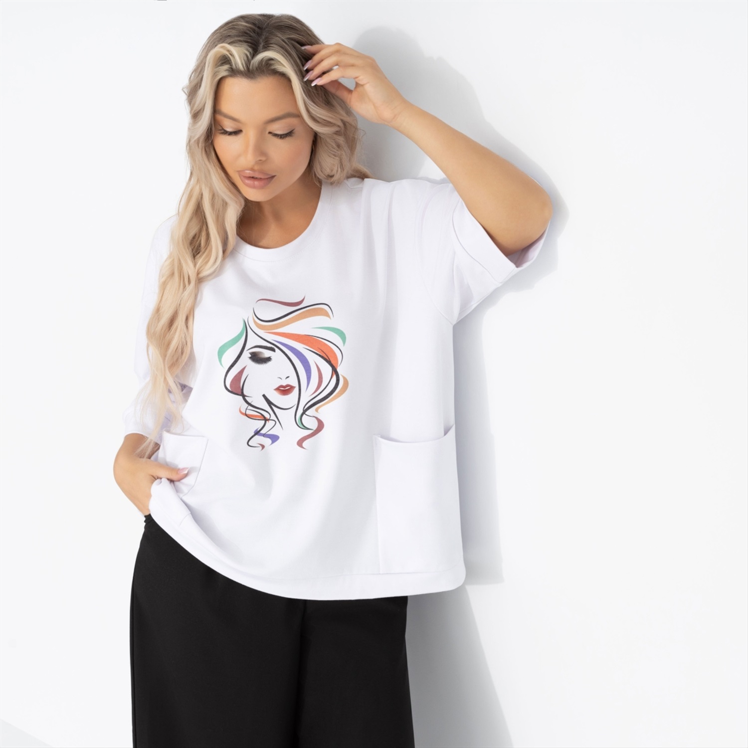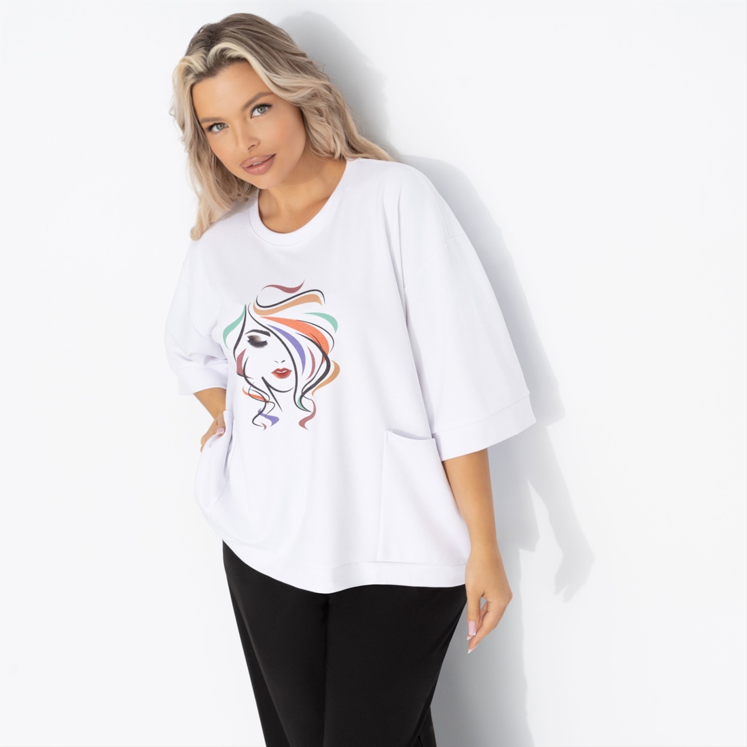 Состав: Милано (65% п/э, 30% вискоза, 5% стрейч) Плотность ткани: Средняя Тип ткани: Трикотаж Вид застежки: Нет Карманы: Накладные Основной цвет ткани: Белый Отрезная талия: Нет Подклад: Нет Резинка по талии: Нет Рисунок/раппорт: Каждое изделие уникально из-за расположения рисунка на ткани Сезон: Круглогодичный Силуэт: Свободный Стиль: Повседневный Параметры модели на фото: