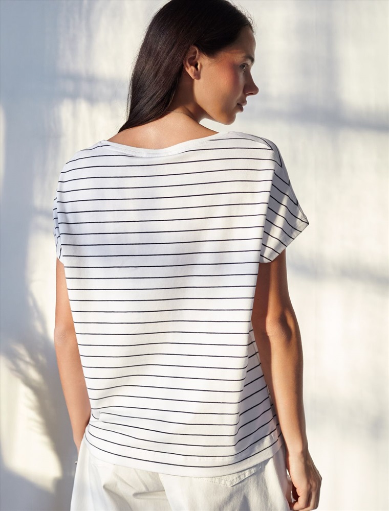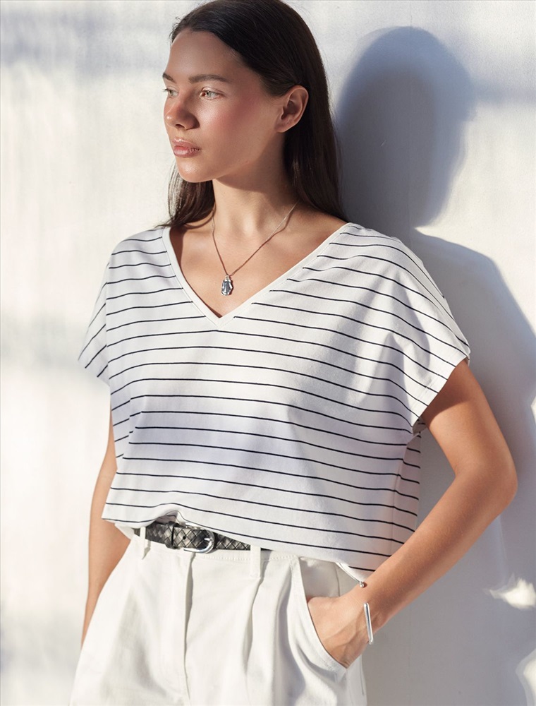 Стильная свободная футболка бело-синего цвета с горизонтальной полоской и выразительным V-вырезом создана для девушек и женщин, которые ценят комфорт и натуральность. Прямой крой обеспечивают непревзойденную легкость в теплую и жаркую погоду, позволяя телу дышать. Натуральный хлопок премиального качества — отличается дышащими свойствами и высокой износостойкостью, подходит для самой чувствительной кожи. V вырез гармонично подчеркивает линию шеи, такой вырез визуально удлиняет силуэт, подчеркивая достоинства фигуры. Цельнокроеный рукав гарантирует свободу движений и аккуратную посадку, что особенно актуально для активного образа жизни. Принт полоска расположена горизонтально, что добавляет образу динамики и современности. Подойдет на большие размеры, комфортно сидит любой фигуре. Повседневная футболка сочетается с базовыми и акцентными элементами одежды, позволяет создавать различные повседневные или яркие образы.