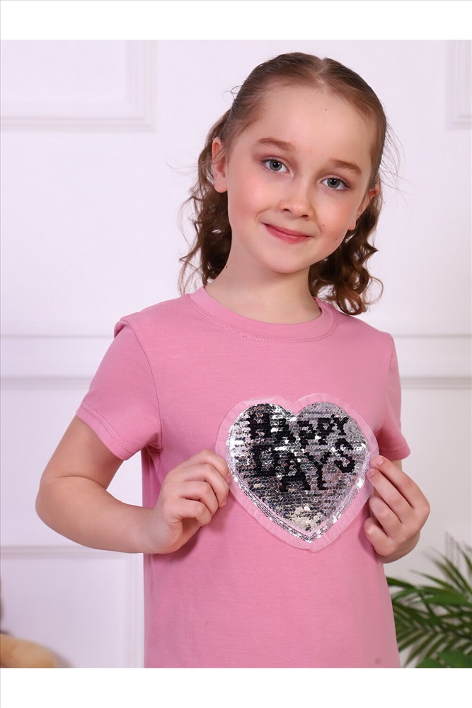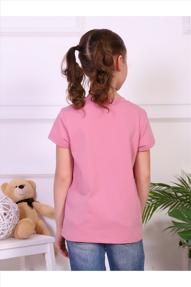 Страна производства: Россия Футболка для девочек дошкольного и младшего школьного возраста, из однотонного трикотажного полотна кулирка с лайкрой. Футболка прямого силуэта, с втачным рукавом, с обтачкой в горловине. Спереди и на спинке отсутствуют линии членения. Рукав одношовный. Низа рукавов и изделия подогнуты. По шву втачивания обтачки в горловину проложена отделочная строчка. Спереди настрочена декоративная нашивка.