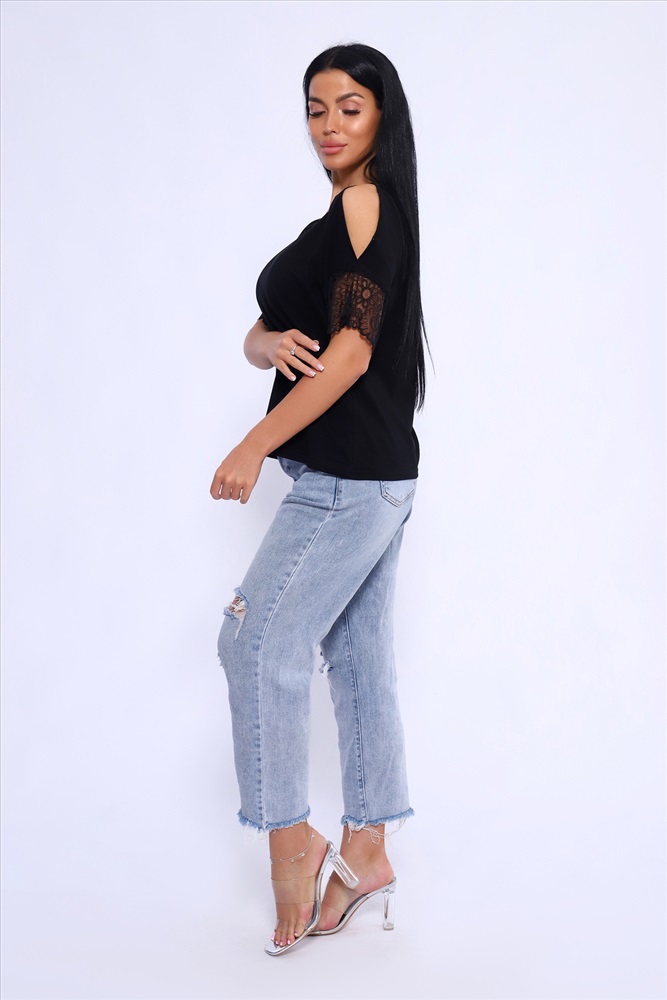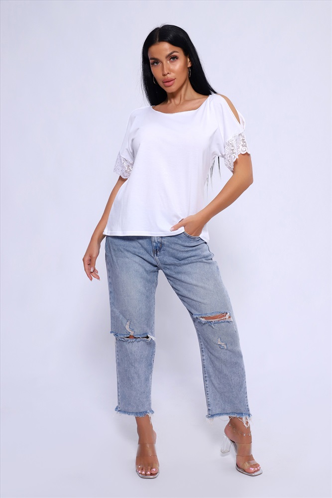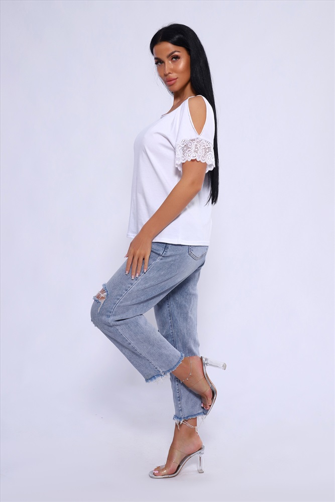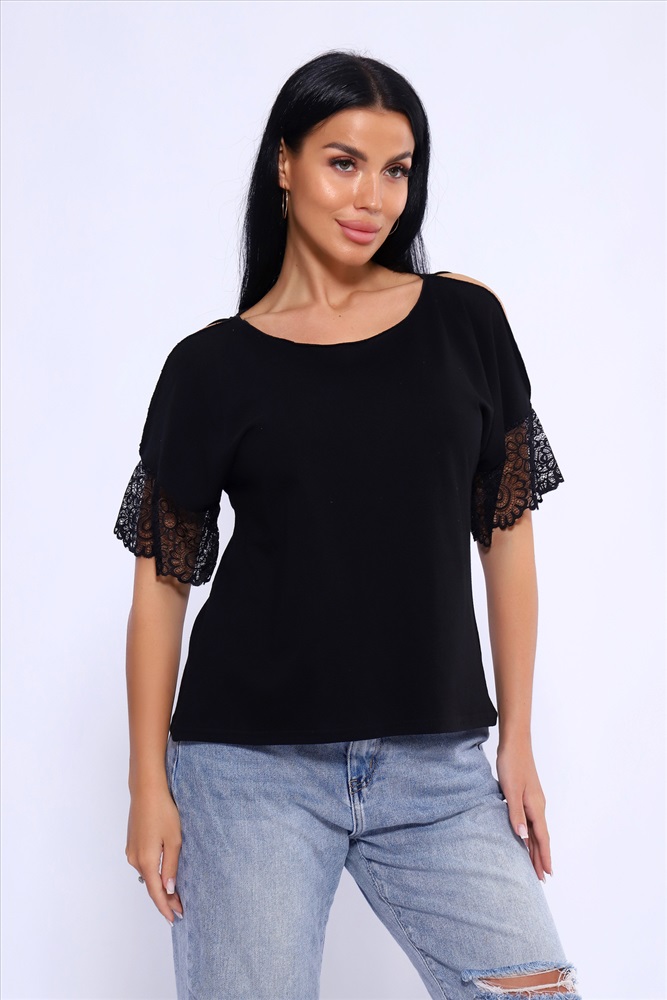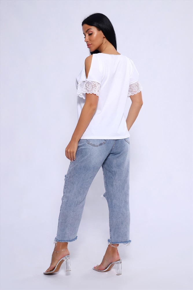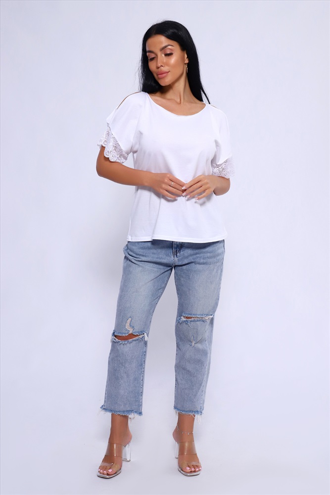 Стиль: повседневный | романтичный Футболка женская из гипоаллергенного хлопкового трикотажа - кулирки высокого качества пенье компакт. Модель слегка приталенного силуэта, горловина и спущенная пройма обработаны краёвкой, что придаёт футболке некую изюминку и индивидуальность. Пройма обработана широким, жаккардовым кружевом в виде короткого рукава. Стильная, комфортная футболка необходимая вещь для модницы любого возраста и фигуры, подойдет как для офисного гардероба так и для отдыха, активного занятия спортом. Длина рукава в таблице измерений указана от начала горловины.