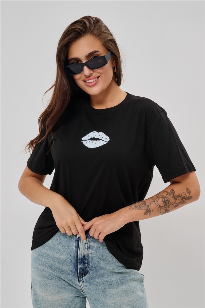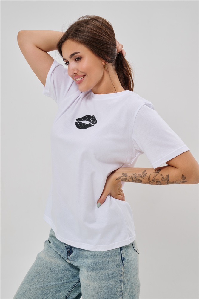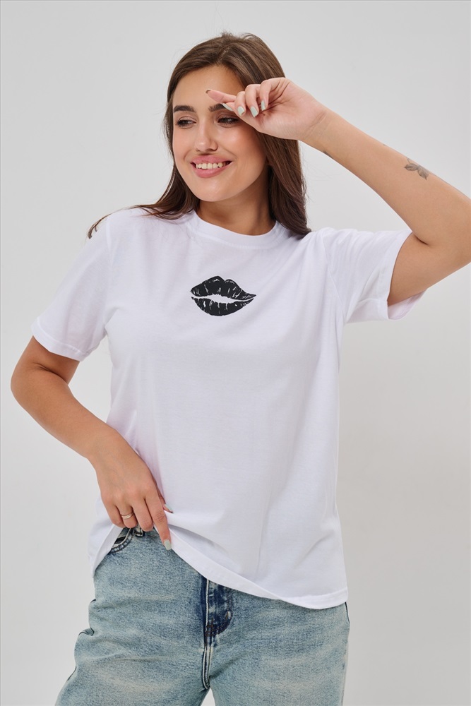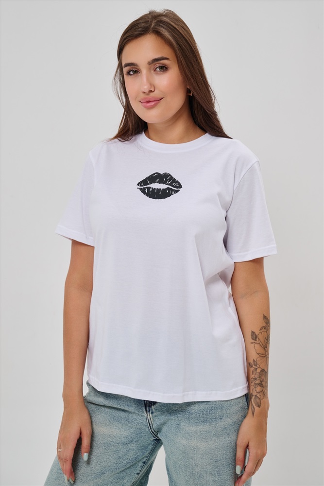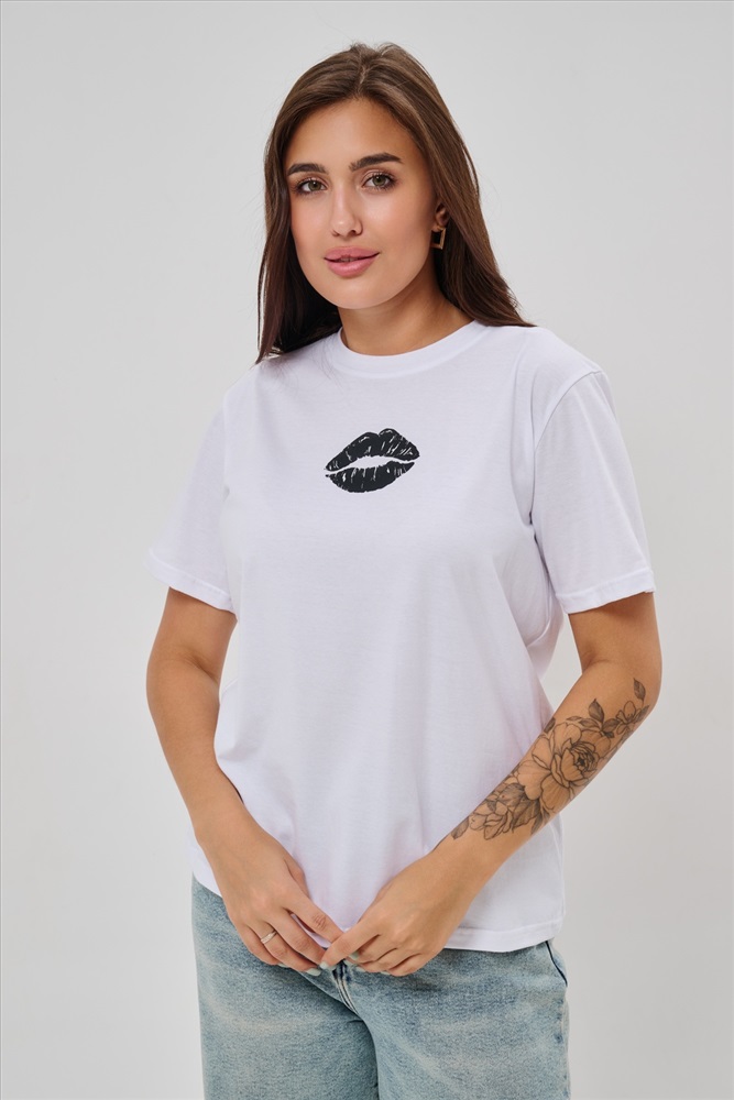 Стиль: повседневный Женская футболка приталенного силуэта, выполненная из мягкой и приятной к телу кулирки. Модель отличается лаконичностью и удобством благодаря укороченным рукавам и аккуратному круглому вырезу горловины. Изюминкой изделия является минималистичный принт в виде груб, выполненные в чёрном оттенке. Футболка универсальна, легко сочетается с различными элементами гардероба и станет отличным выбором для повседневной носки, подчёркивая женственную фигуру и индивидуальность своей обладательницы.