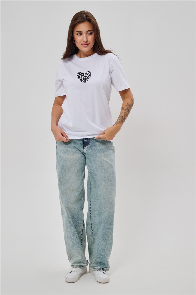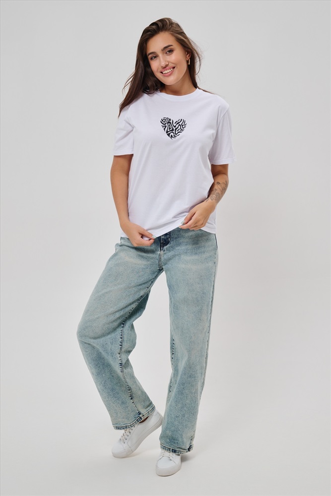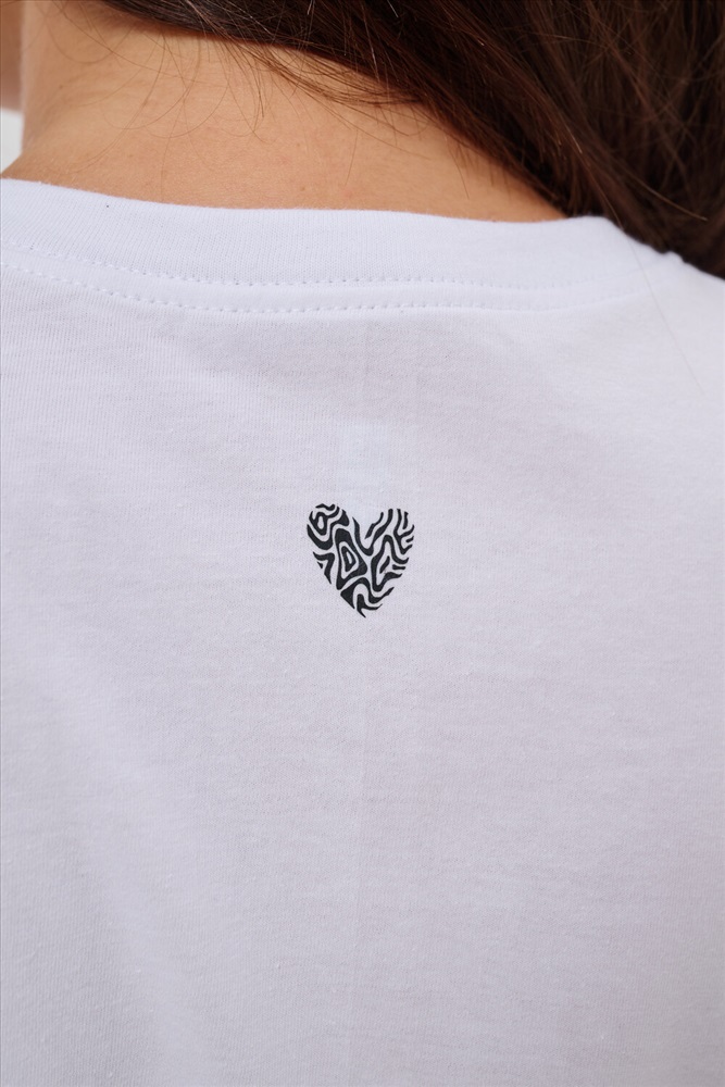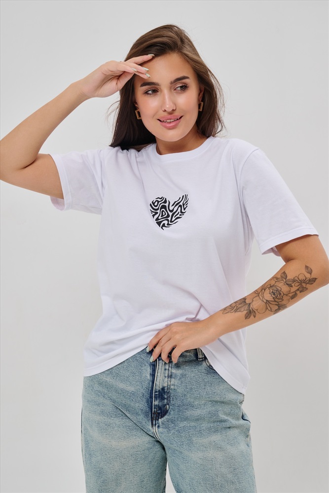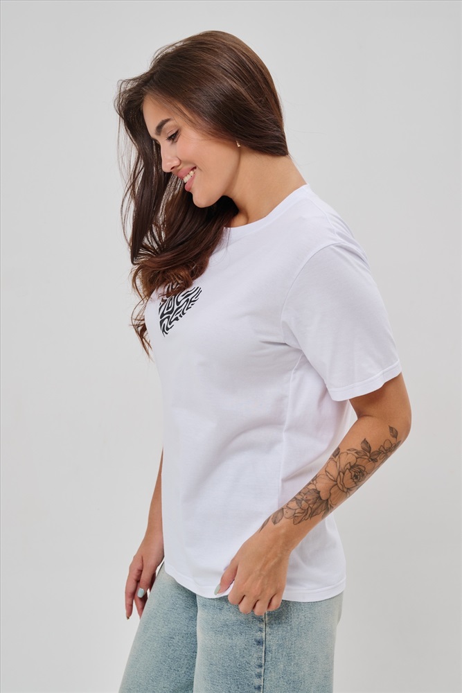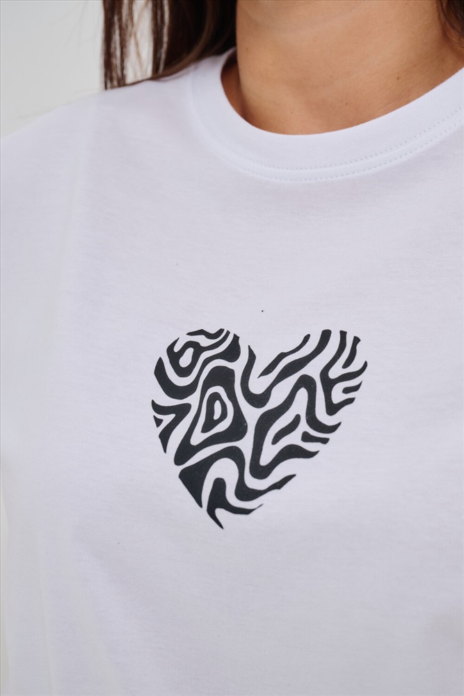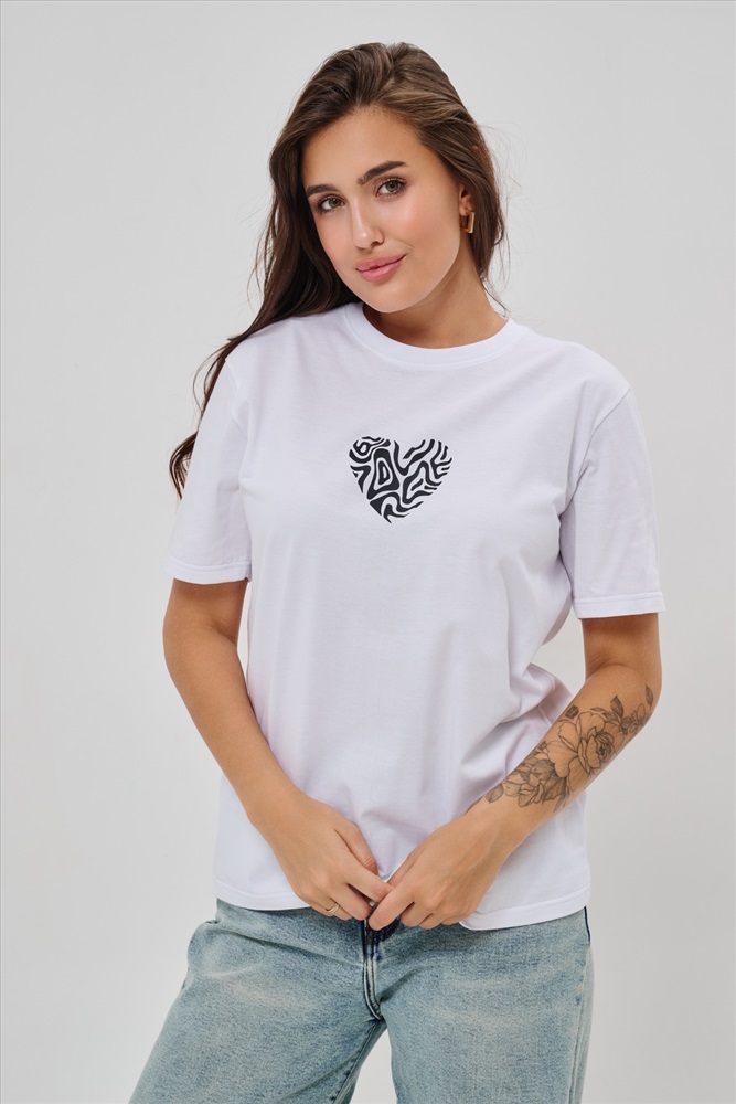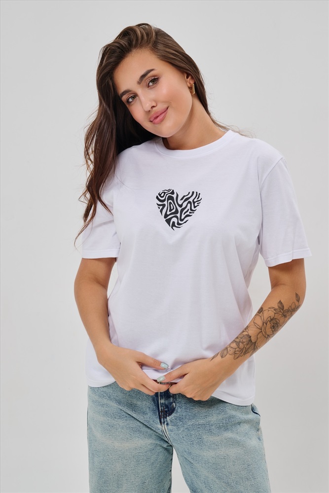 Стиль: повседневный Женская футболка элегантного приталенного кроя с короткими рукавами и классическим круглым вырезом горловины. Минималистичный дизайн дополнен нежным принтом в форме сердца с узором зебры, создающими тонкий акцент на образ. Материал приятен к телу, обеспечивает комфорт и свободу движений. Идеально подойдет для повседневного стиля, подчеркивая женственность и утонченность облика обладательницы.