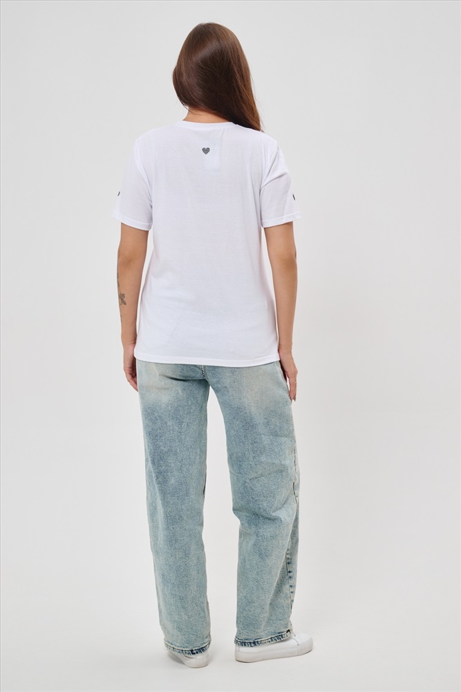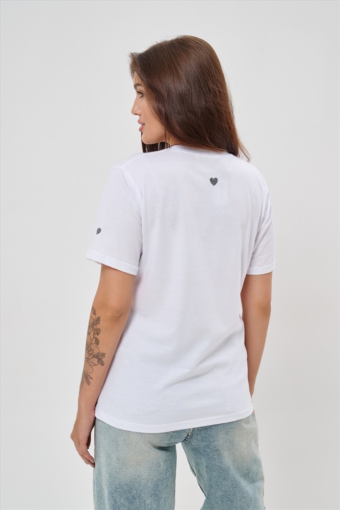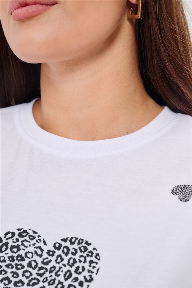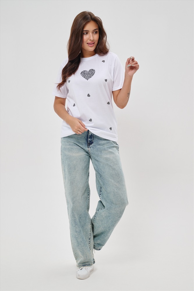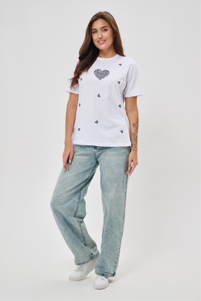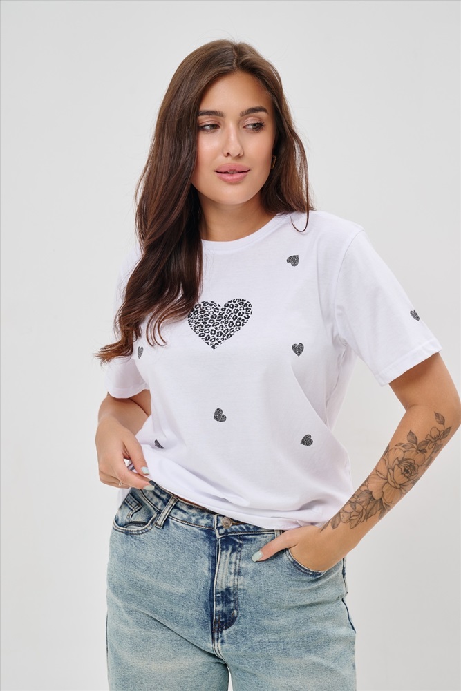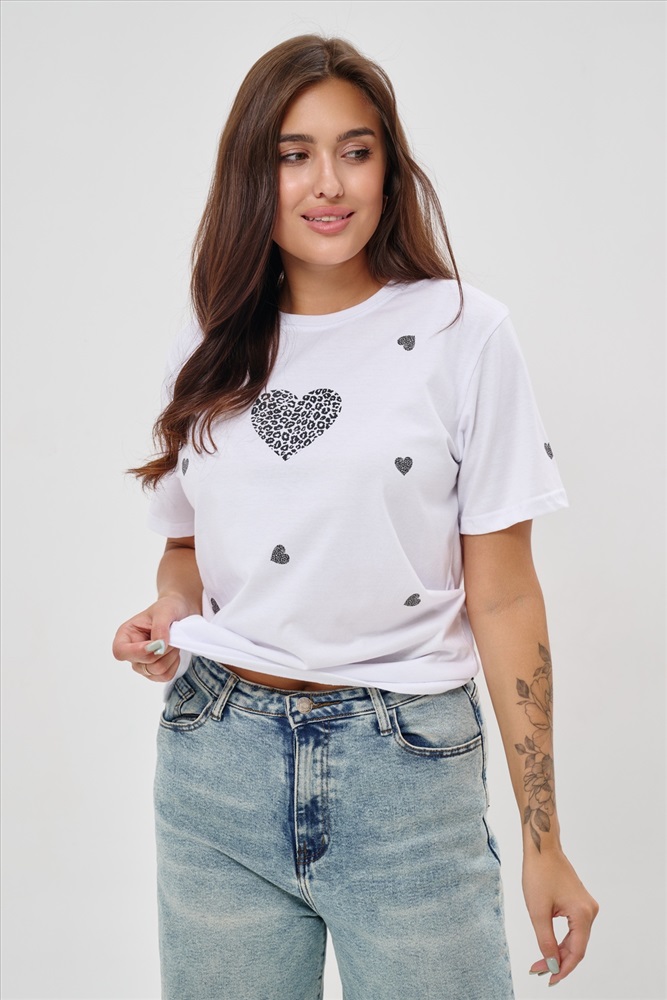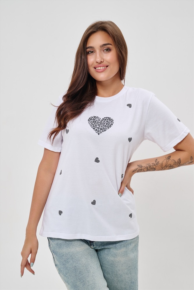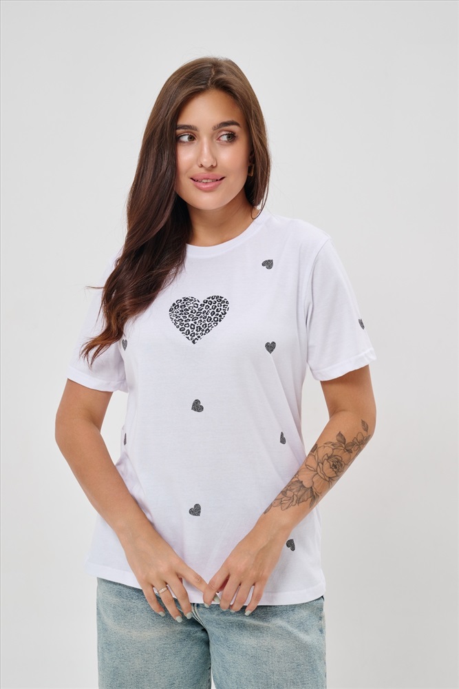 Стиль: повседневный Женская футболка элегантного приталенного кроя с короткими рукавами и классическим круглым вырезом горловины. Минималистичный дизайн дополнен нежными маленькими принтами в форме сердец с леопардовым узором, создающими тонкий акцент на образ. Материал приятен к телу, обеспечивает комфорт и свободу движений. Идеально подойдет для повседневного стиля, подчеркивая женственность и утонченность облика обладательницы.