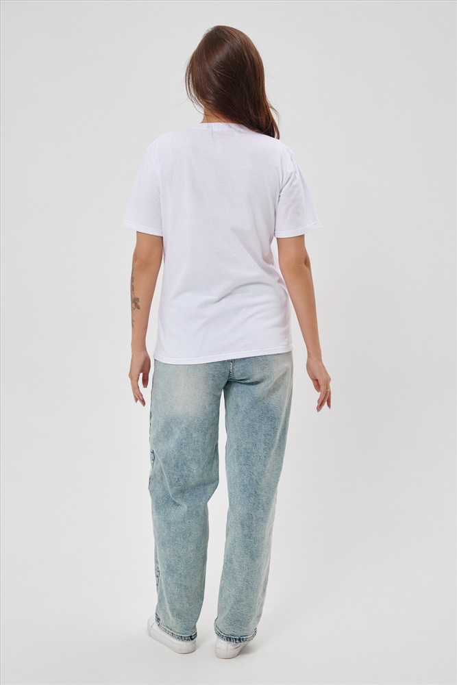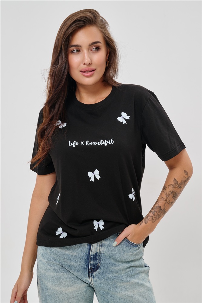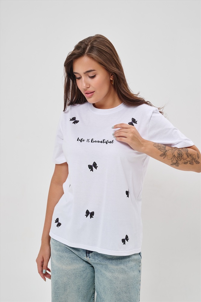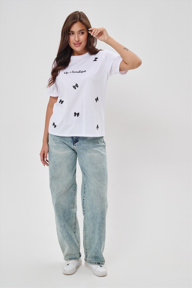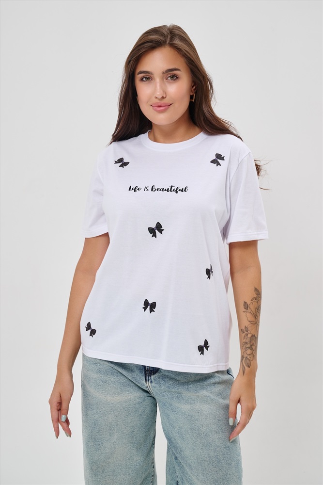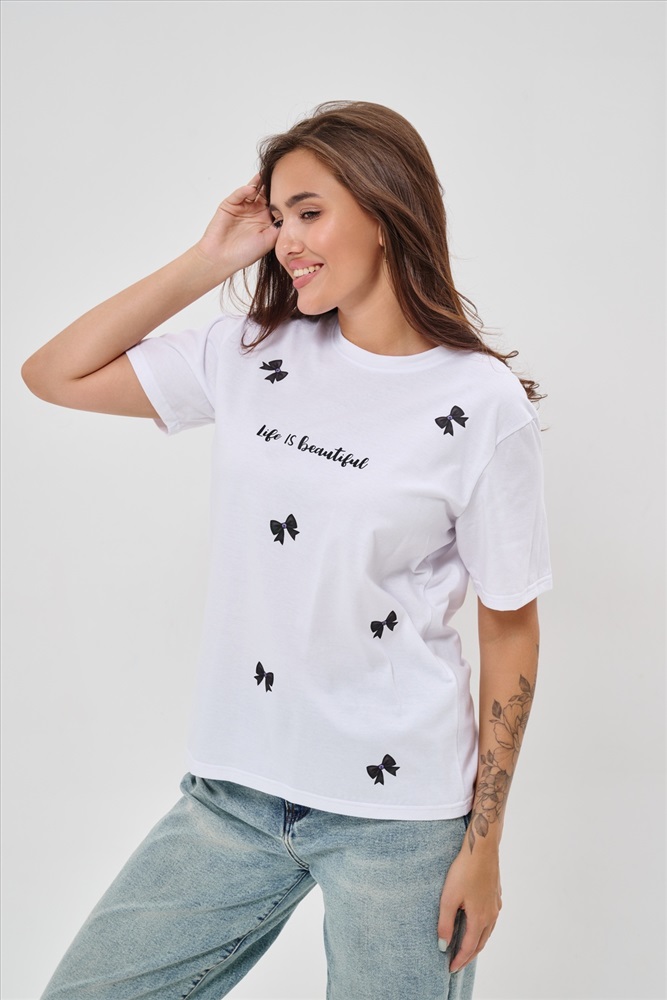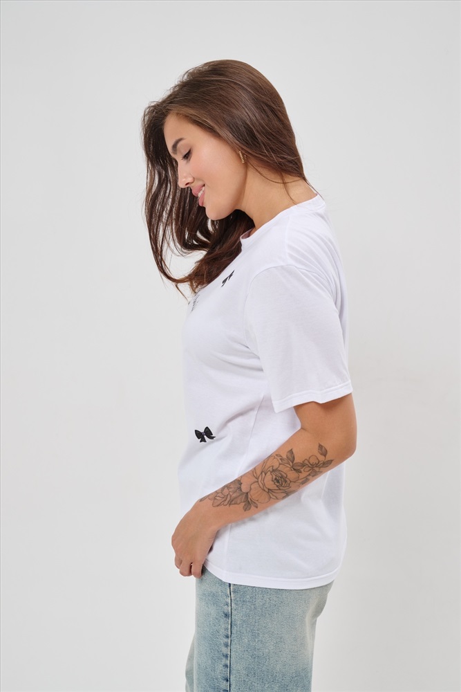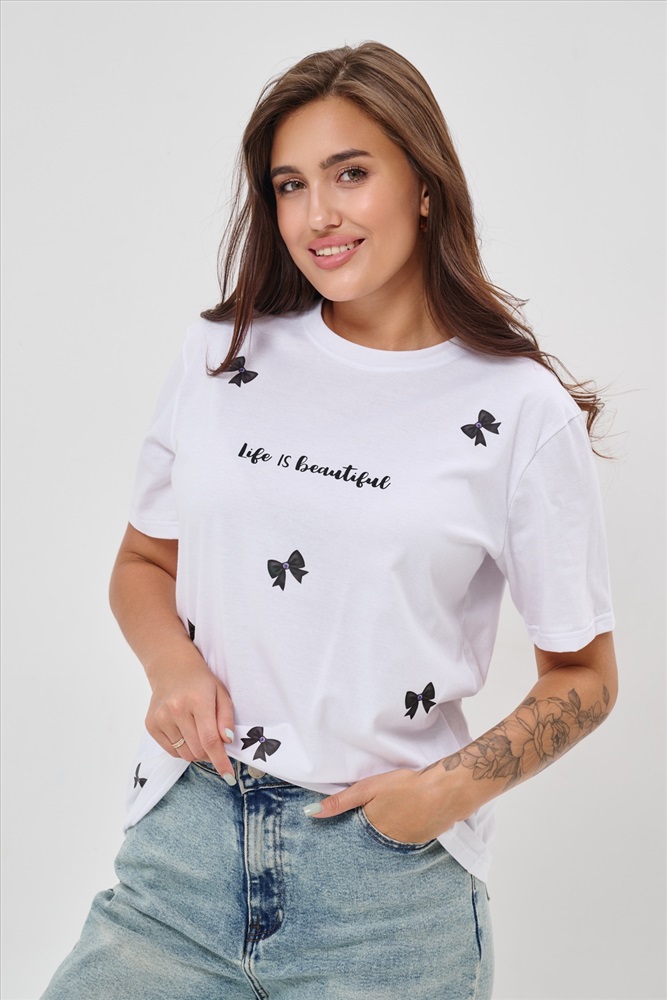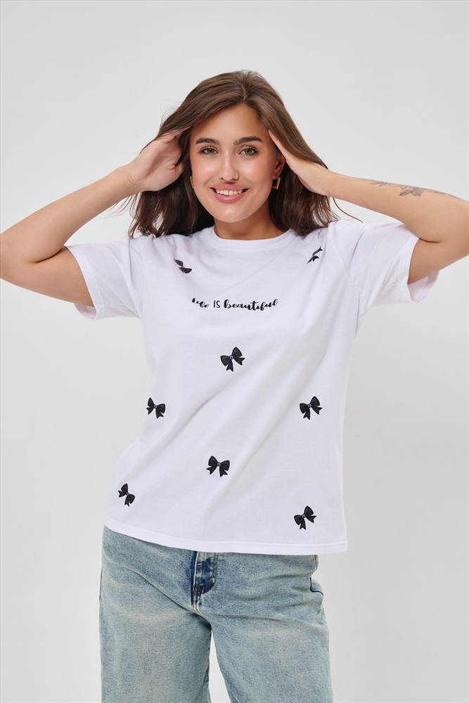 Стиль: повседневный Женская футболка приталенного кроя, изготовлена из мягкого материала кулирки. Элегантная форма с короткими рукавами и аккуратным круглым вырезом создают ощущение лёгкости и свежести образа. Особенное внимание привлекает надпись на груди, украшенная минималистичными маленькими бантиками в сдержанном чёрном цвете. Такая деталь добавляет образу шарма и игривости, оставаясь одновременно простой и изысканной. Футболка легко впишется в гардероб современной девушки, добавив нотку кокетства любому образу.
