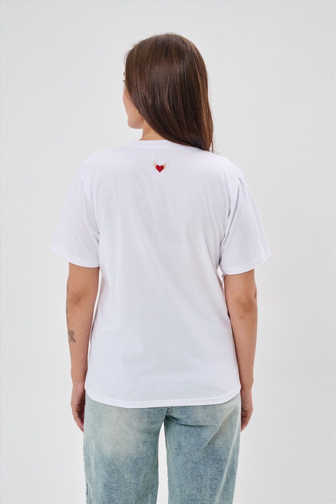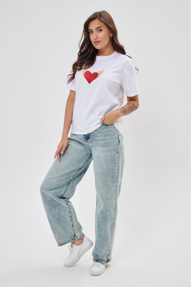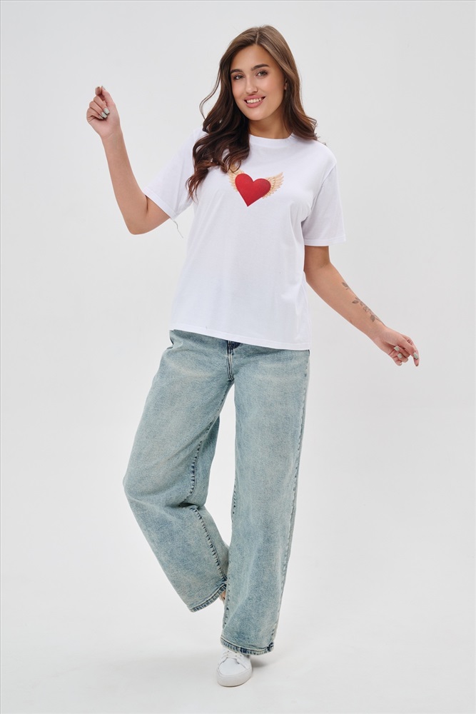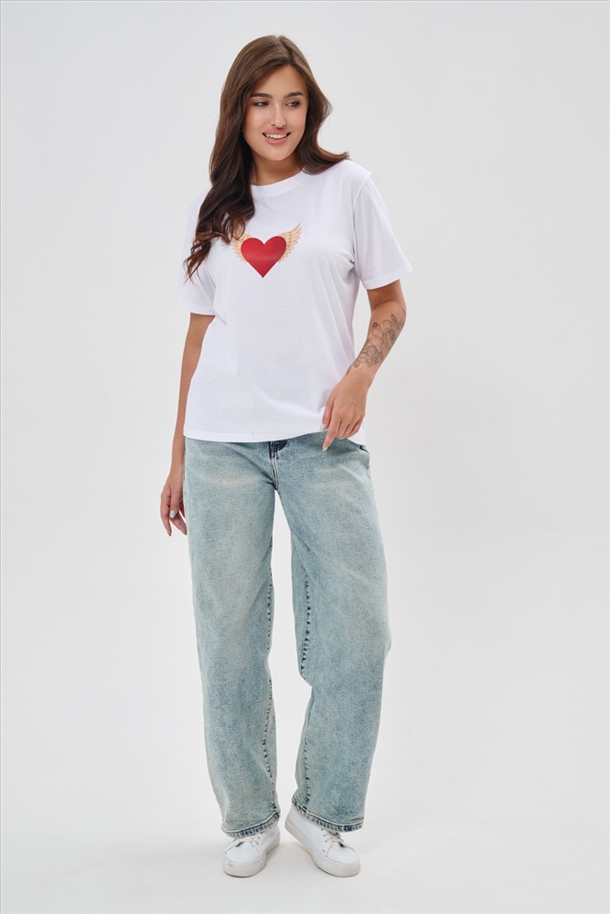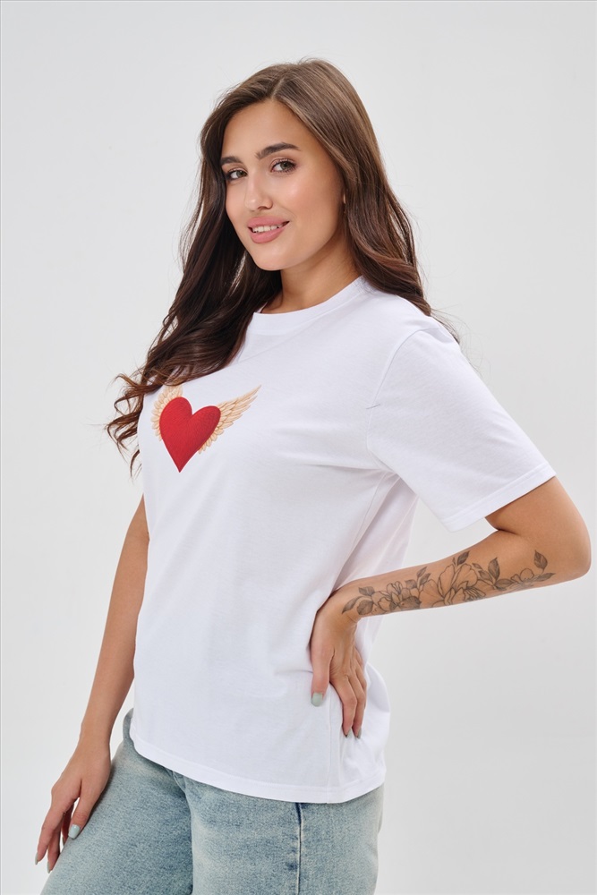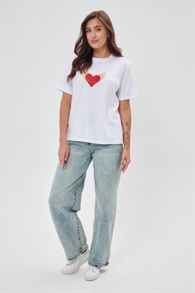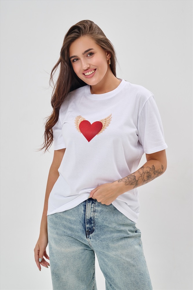 Стиль: повседневный Женская футболка приталенного кроя из кулирки, идеально подчеркивает линии фигуры. Классический короткий рукав и круглый вырез делают её удобной и повседневной. Центральная деталь изделия оригинальный принт на груди в виде красного сердца с крыльями, символично объединяя романтичность и воздушность. Такая футболка обязательно привлечёт внимание и станет любимой вещью вашего гардероба!