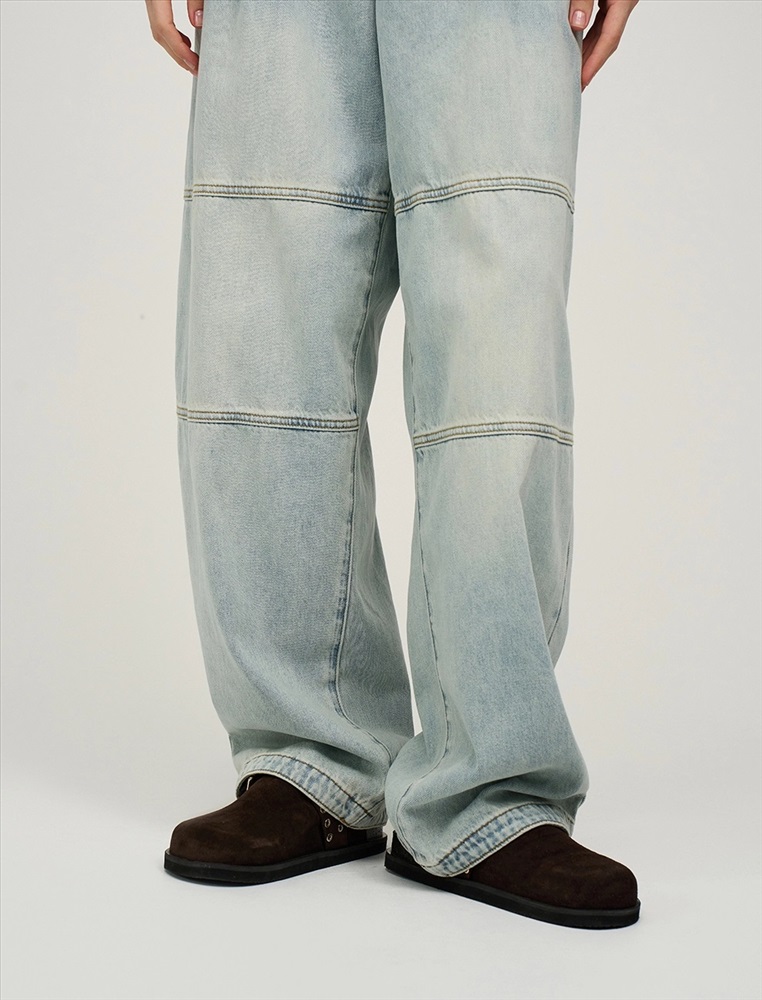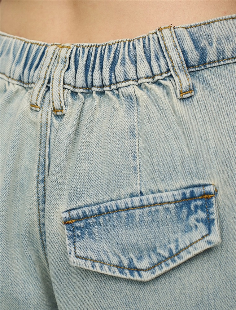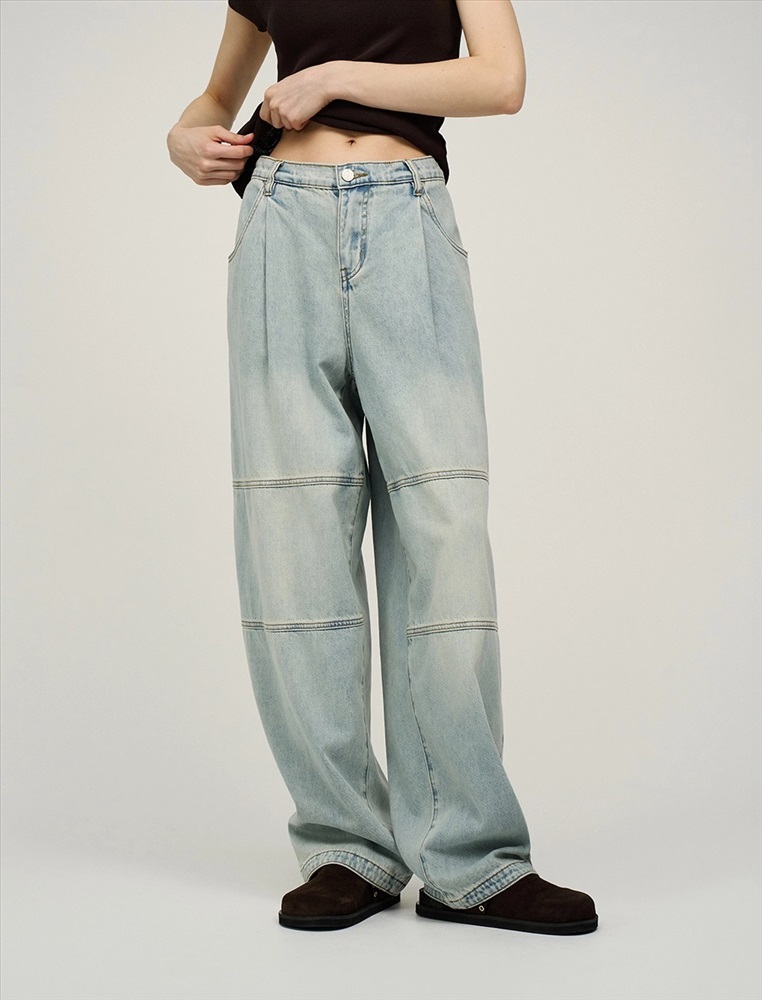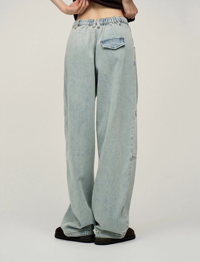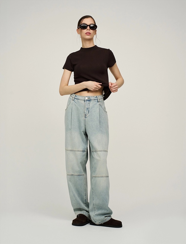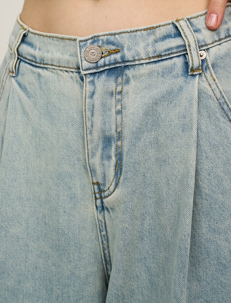 Джинсы широкие, посадка на уровне ниже талии. В поясе эластичная резинка. По передней части изделия - гульфик с застежкой на молнию и пуговицу. На уровне бедер защипы. По бокам косые карманы. В районе колен декоративные резы. Выполнены из хлопка и тенсела. Представлены в голубом оттенке.