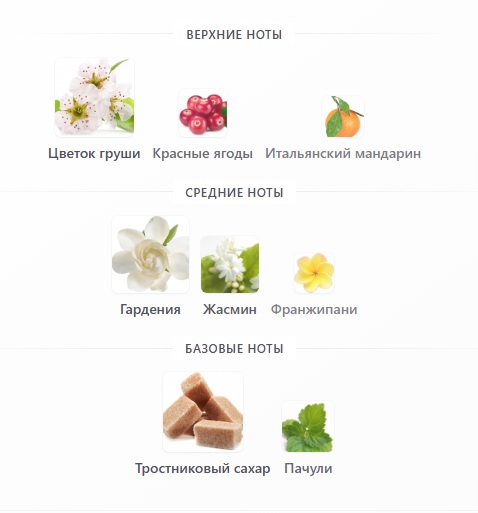 Верхние ноты: Цветок груши, Красные ягоды и Итальянский мандарин; средние ноты: Гардения, Жасмин и Франжипани; базовые ноты: Тростниковый сахар и Пачули.