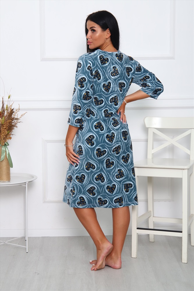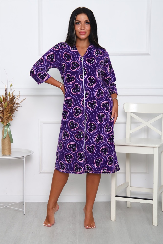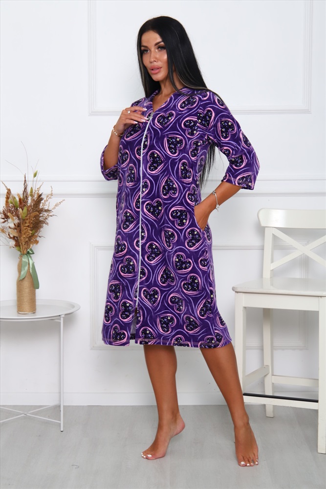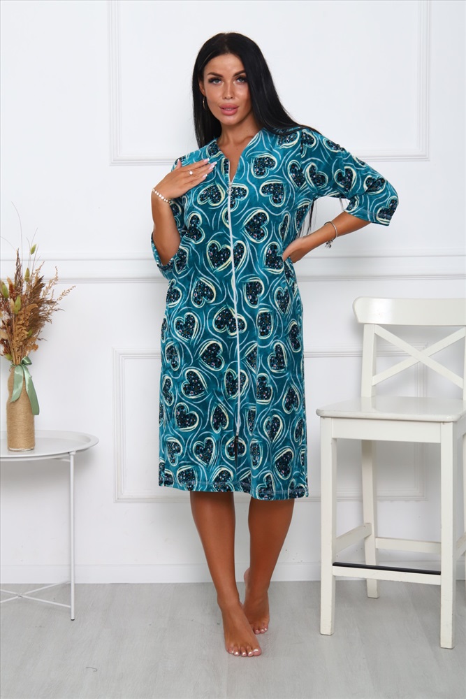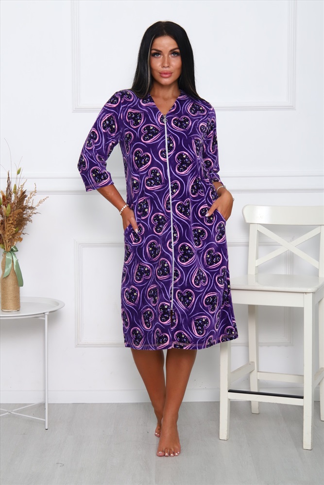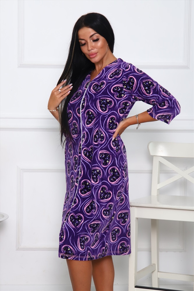 Застежка: молния Халат женский на молнии из набивного велюра полуприлегающего силуэта. Горловина халата имеет V-образный вырез, обработана обтачкой, рукав 3/4, карманы. Халат прекрасно подойдет для дома и отдыха.