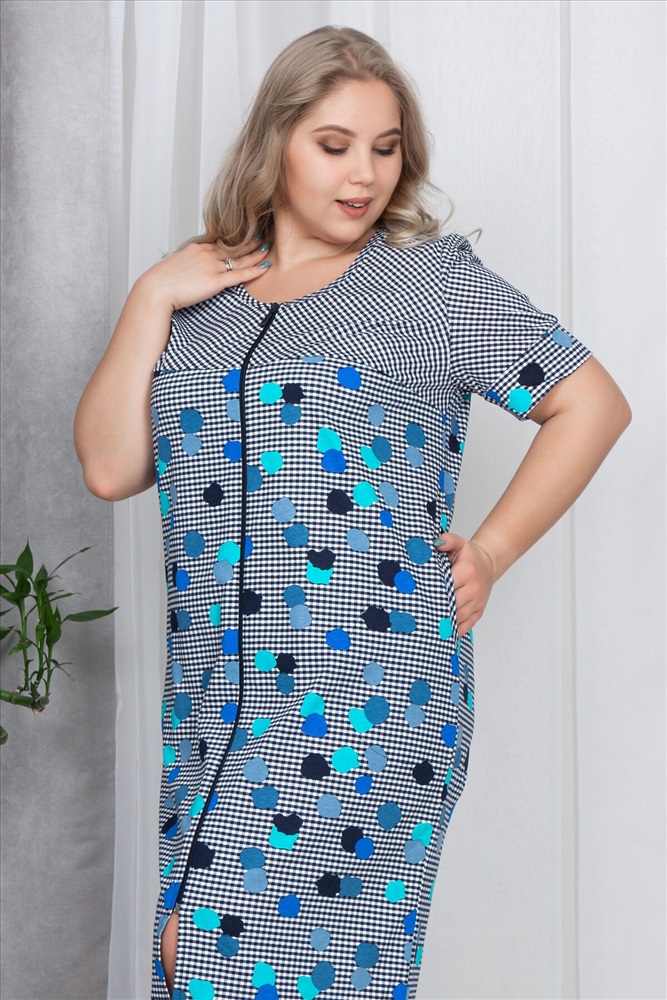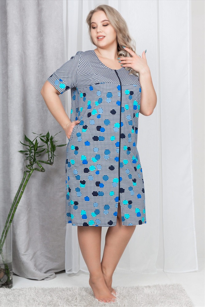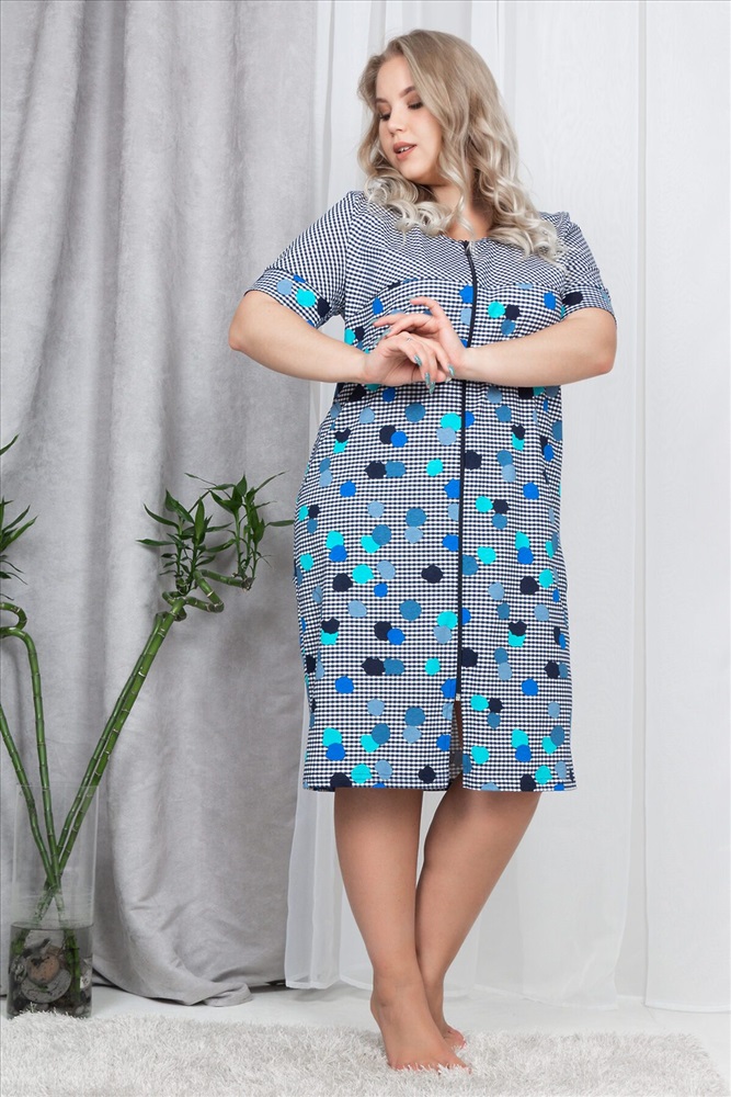 ID товара: 738538 Состав: 100% Хлопок Сезон: Демисезон Длина: Ниже колена Фасон: Полуприлегающий Рукав: Короткие Вид застежки: Молния Декоративные элементы: Принт Основная ткань: Хлопок | Кулирка Стиль: Повседневный Страна бренда: Россия Страна производства: Россия Халат женский домашний на молнии. По груди кокетка, карман в боковом шве, на рукавах манжет. Комментарии к товару