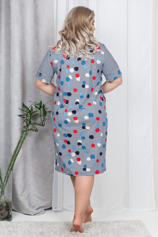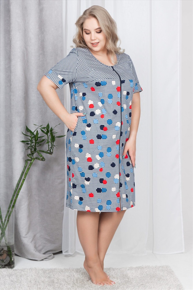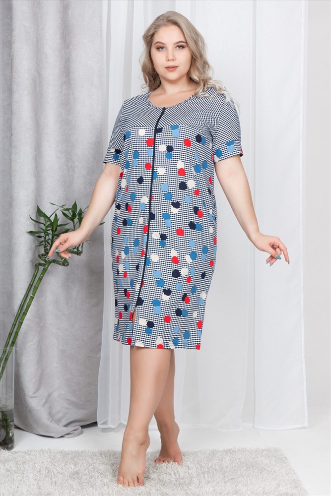 ID товара: 738539 Состав: 100% Хлопок Сезон: Демисезон Длина: Ниже колена Фасон: Полуприлегающий Рукав: Короткие Вид застежки: Молния Декоративные элементы: Принт Основная ткань: Хлопок | Кулирка Стиль: Повседневный Страна бренда: Россия Страна производства: Россия Халат женский домашний на молнии. По груди кокетка, карман в боковом шве, на рукавах манжет. Комментарии к товару