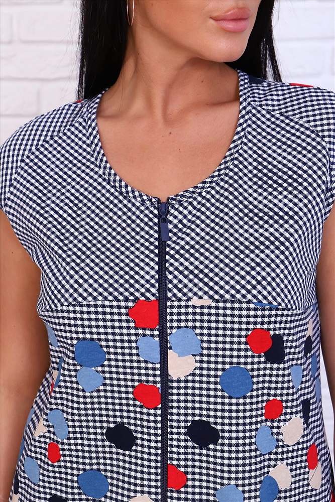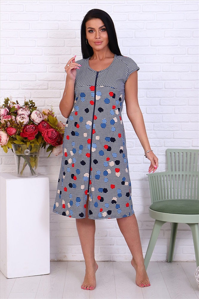 Страна производства: Россия Халат женский на молнии, с коротким рукавом-реглан. Свободного силуэта, с двумя боковыми карманами, отрезными кокетками на груди из отделочной ткани. Длина чуть ниже колена. Халат изготовлен из 100% хлопка (кулирка), что дает гарантию комфорта и уюта, при его носке.