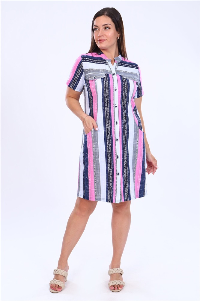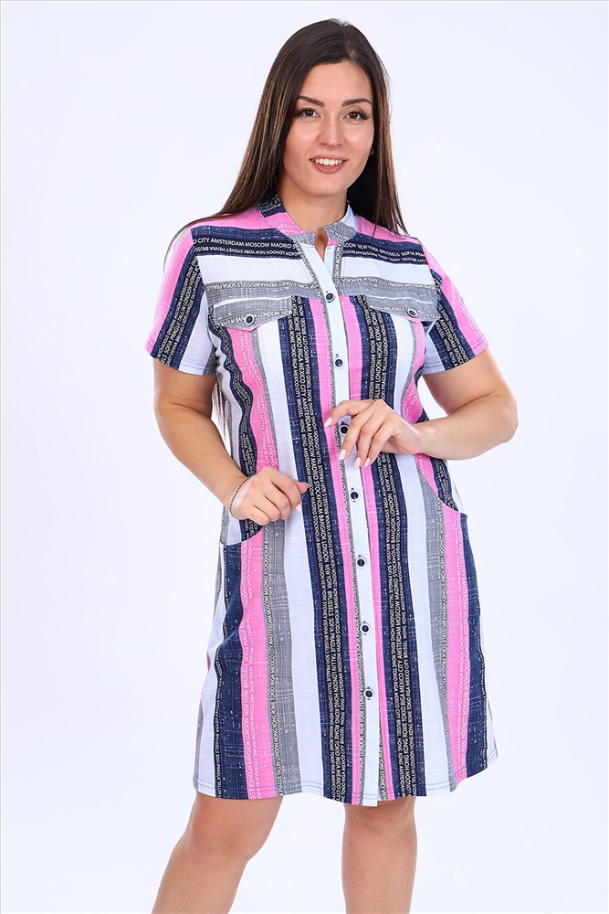 Страна производства: Россия Халат выполнен в рубашечном стиле, с центральной застёжкой на пуговицах, воротник - стойка. Короткий втачной рукав.