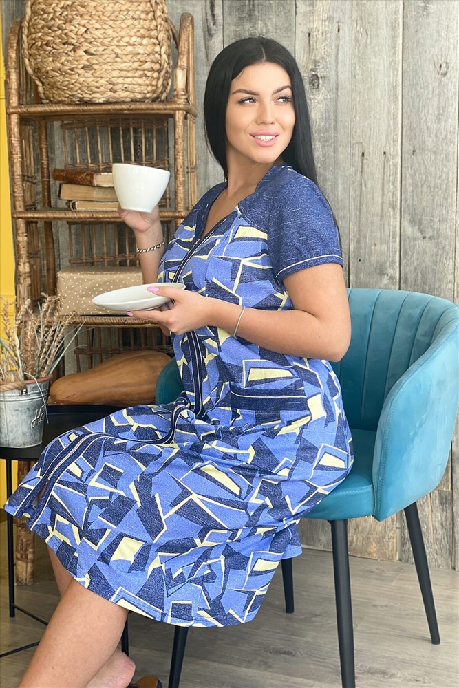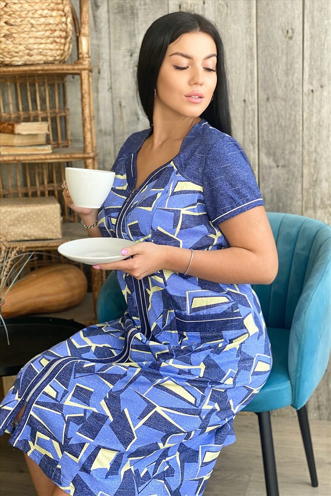 Халат полуприлегающего силуэта из кулирки. На полочке и спинке рельефы. Рукав втачной короткий, застежка на молнию. Горловина, край борта, низ рукавов и накладные карманы отделаны широкой косой бейкой и белым кантом. Цветочный дизайн, длина чуть ниже коленей