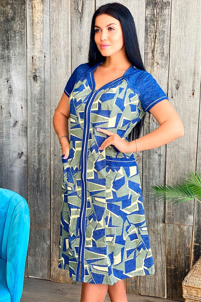 Страна производства: Россия Халат полуприлегающего силуэта из кулирки. На полочке и спинке рельефы. Рукав втачной короткий, застежка на молнию. Горловина, край борта, низ рукавов и накладные карманы отделаны широкой косой бейкой и белым кантом. Цветочный дизайн, длина чуть ниже коленей