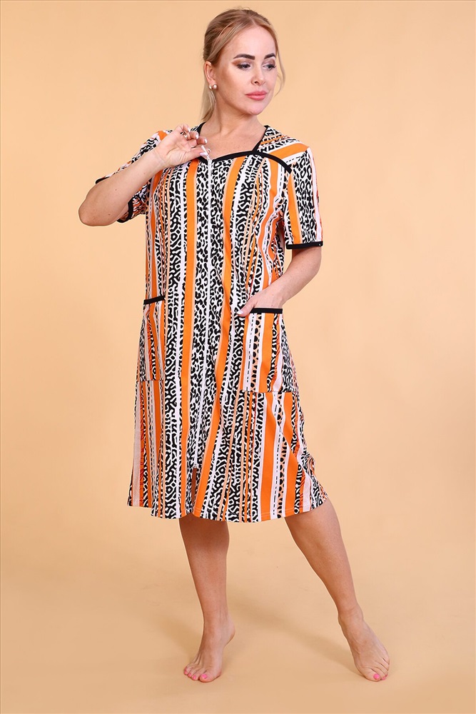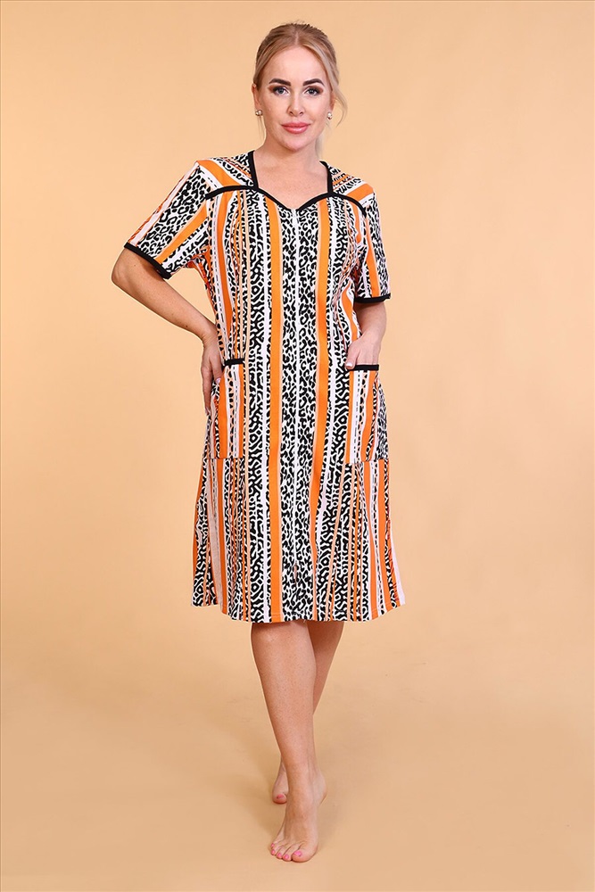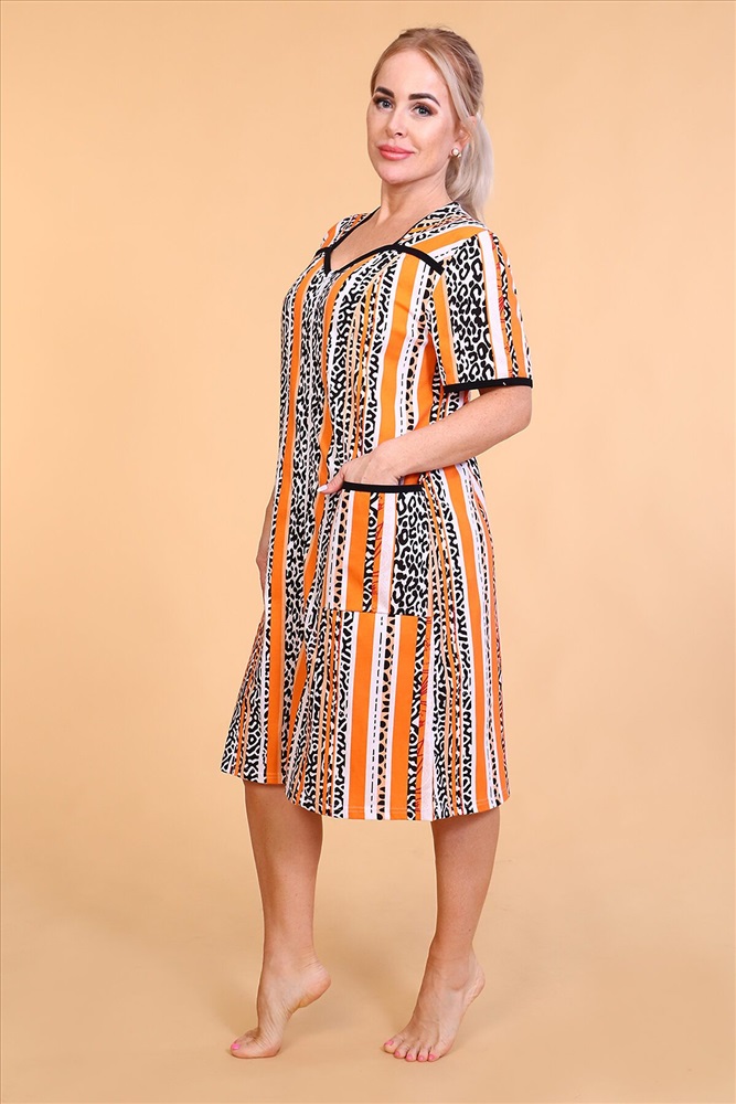 Страна производства: Россия Халат женский из тонкого трикотажного полотна на молнии с накладными карманами, рукав короткий втачной, на полочке рельефы.