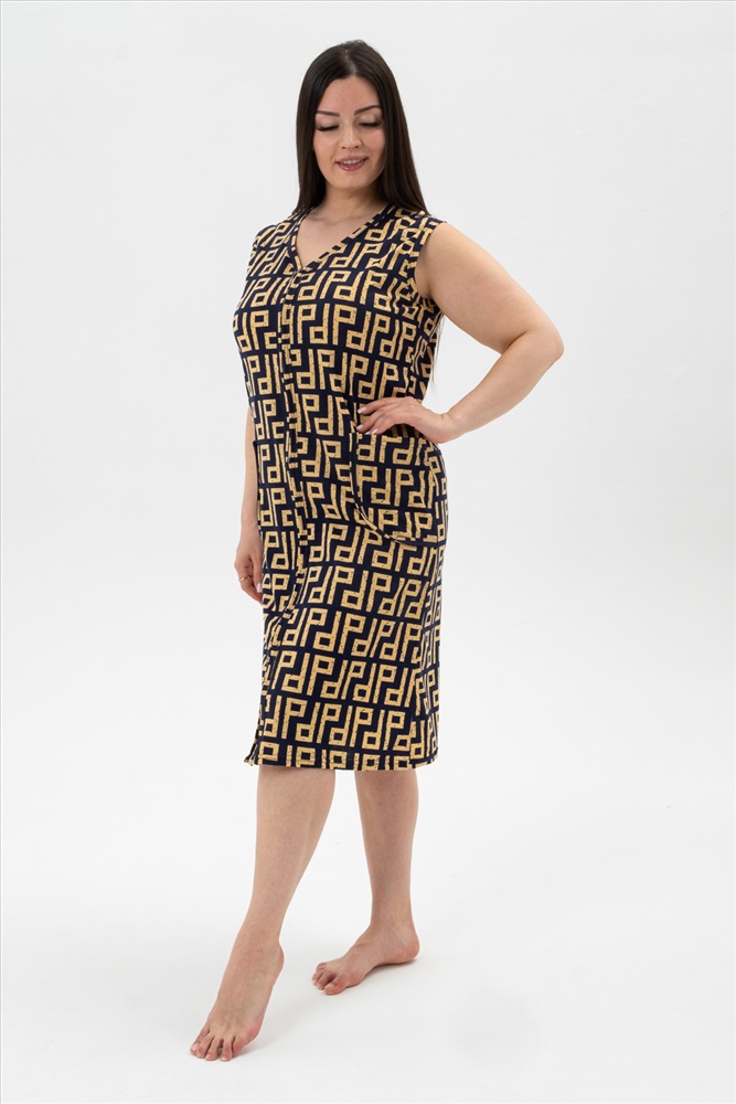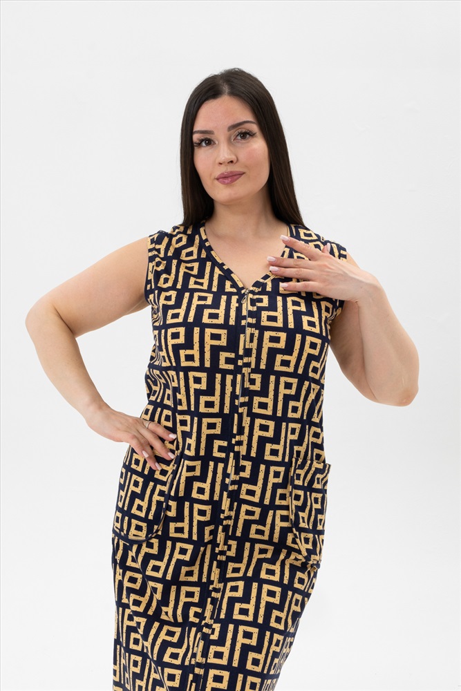 Состав: Хлопок 100% Модель: Халат №21608 Тип товара: халат Материал: кулирка | кулирка Бренд: Натали Суслова Длина: средняя длина Карман: накладные Назначение: для дома НДС: 5% Отделка: с карманами Рисунок: геометрия Рукав: без рукава Сезонность: лето | весна Силуэт: полуприлегающий Стиль: домашний Воротник: без воротника Застежка: молния Халат-сарафан на молнии для дома и дачи. Простой, удобный, ничего лишнего. Рекомендуется стирка при 30 градусах. Оригинальная расцветка, накладные карманы. Носите с удовольствием. Таблица размеров и веса