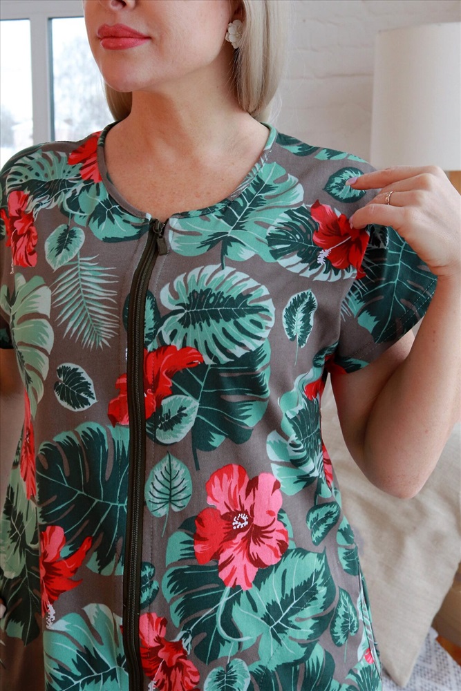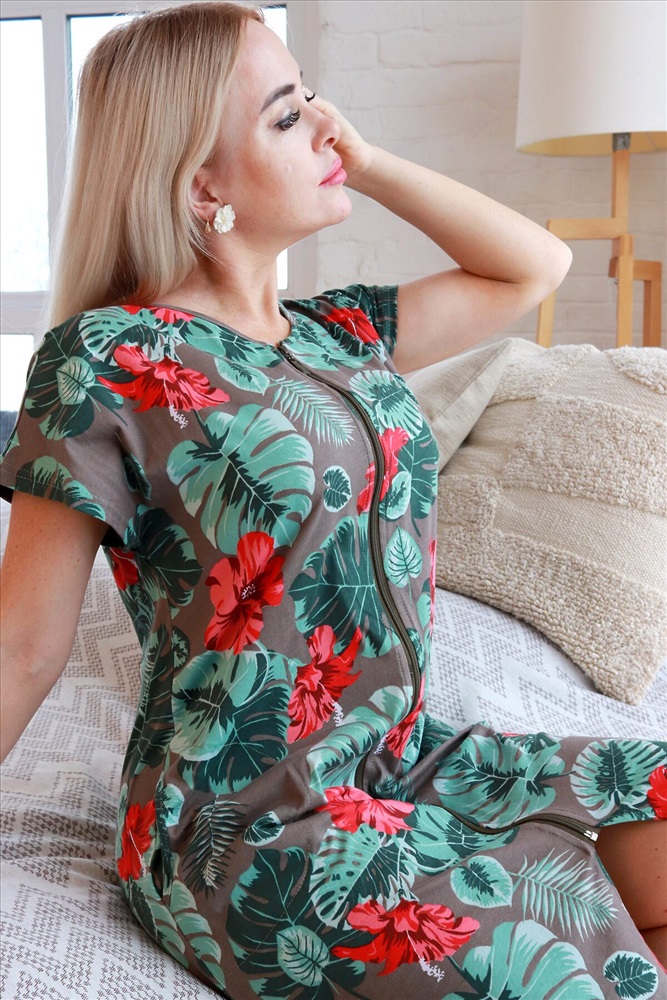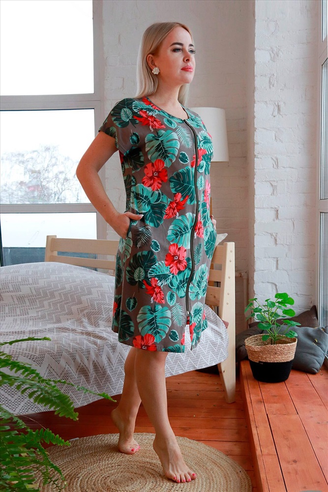 ID товара: 765106 Состав: 100% Хлопок Сезон: Весна/Лето Длина: До колена Фасон: Полуприлегающий Рукав: Короткие Вид застежки: Молния Декоративные элементы: Принт Основная ткань: Хлопок | Кулирка Стиль: Повседневный Страна бренда: Россия Страна производства: Россия Женский халатик на молнии. Удобный и легкий вариант для дома. Комментарии к товару