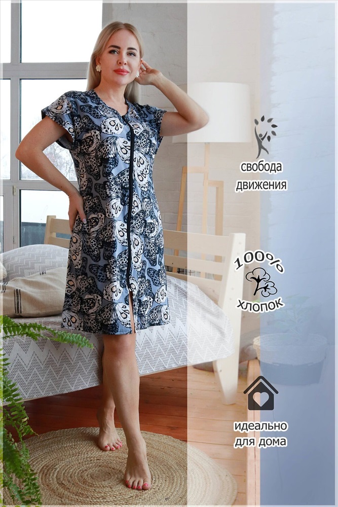 ID товара: 765107 Состав: 100% Хлопок Сезон: Демисезон Длина: До колена Фасон: Полуприлегающий Рукав: Короткие Вид застежки: Молния Декоративные элементы: Принт Основная ткань: Хлопок | Кулирка Стиль: Повседневный Страна бренда: Россия Страна производства: Россия Женский халатик на молнии. Удобный и легкий вариант для дома. Комментарии к товару