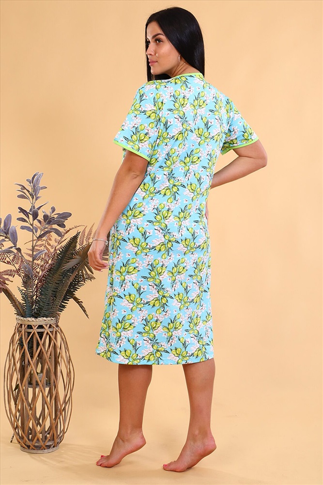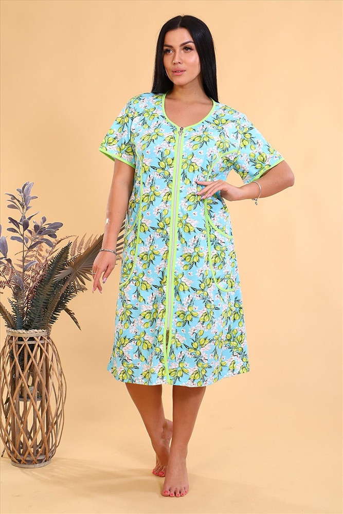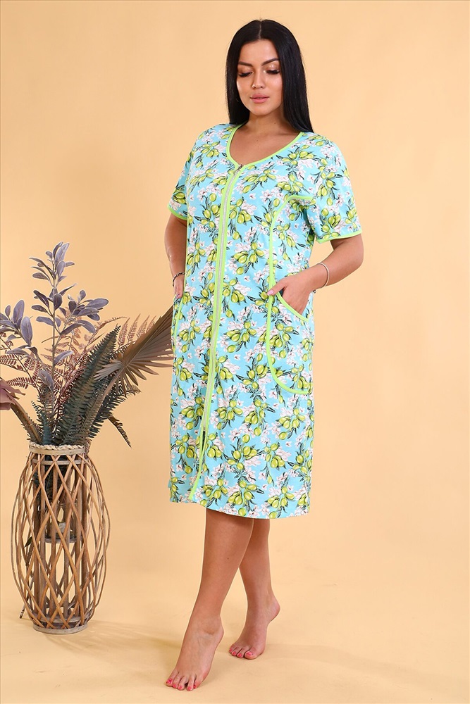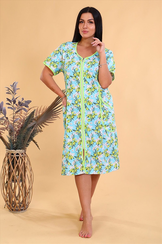 Страна производства: Россия Легкий женский халатик с короткими втачными рукавами. По полочке рельефы, уходящие в боковые швы по линии кармана. Рукава, входы в карман, рельефные швы обработаны контрастной окантовкой. Длина изделия чуть ниже колена, застежка - молния.