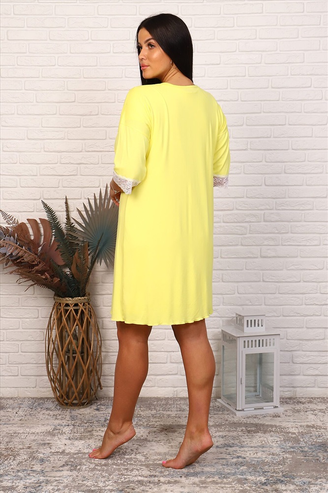 Модель свободного силуэта, длиной чуть выше колена, рукав 3/4 отделан кружевом, полочки соединяются завязками. Пеньюар изготовлен из приятной и комфортной вискозы, замечательно сочетается с сорочкой 24617