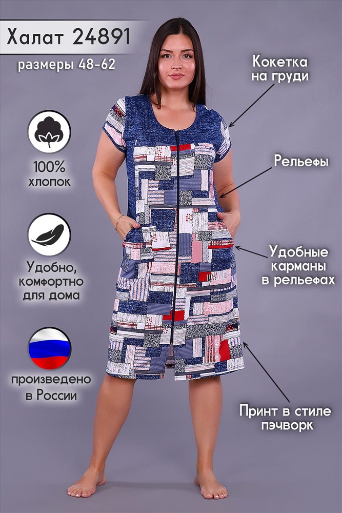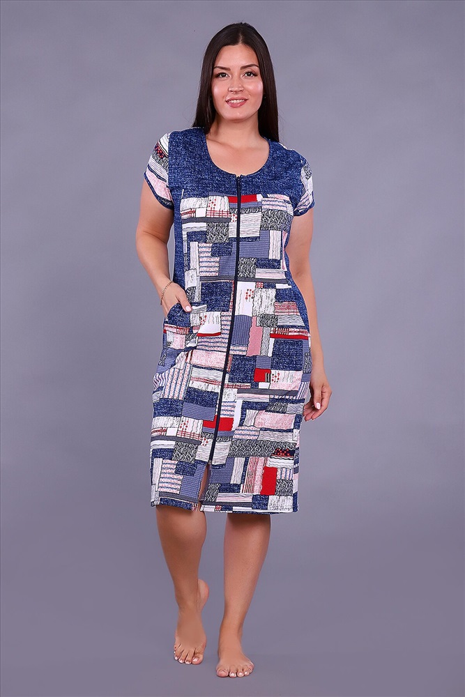 ID товара: 876127 Состав: Хлопок 100% Сезон: Демисезон Длина: Ниже колена Фасон: Полуприлегающий Рукав: короткие Вид застежки: Молния Декоративные элементы: Принт Основная ткань: Кулирка Страна бренда: Россия Страна производства: Россия Халат женский на молнии из комбинированного хлопкового трикотажа в стиле пэчворк. Модель слегка приталенного силуэта с рельефами, на груди кокетка, втачной короткий рукав, внизу в рельефах удобные карманы. Домашний халатик удобный, комфортный для дома, дачи и просто для отдыха. Комментарии к товару