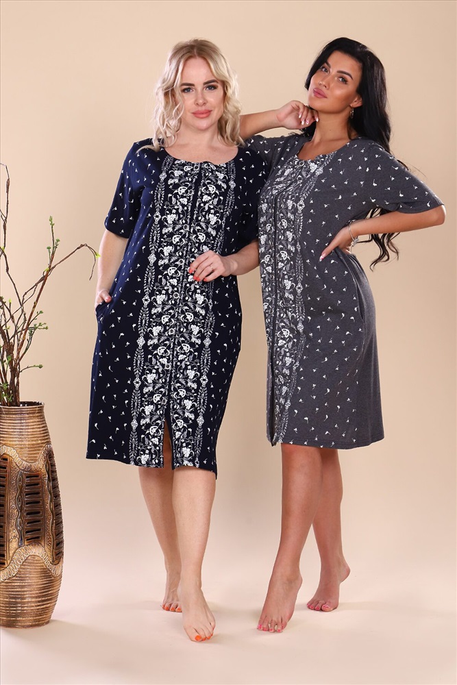 Уютный женский халат из трикотажной ткани (кулирка, хлопок 100%). Представлен в 3-х цветовых вариантах - благородный синий, нежный ментол и сдержанный антрацит. Легкая хлопковая ткань изделия позволит заниматься домашними делами сохраняя чувство комфорта, а нежный принт из мелких цветов, группирующихся к центру в ажурный узор, сделает хозяйку нарядной и немного загадочной.