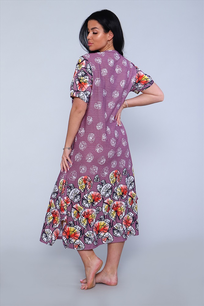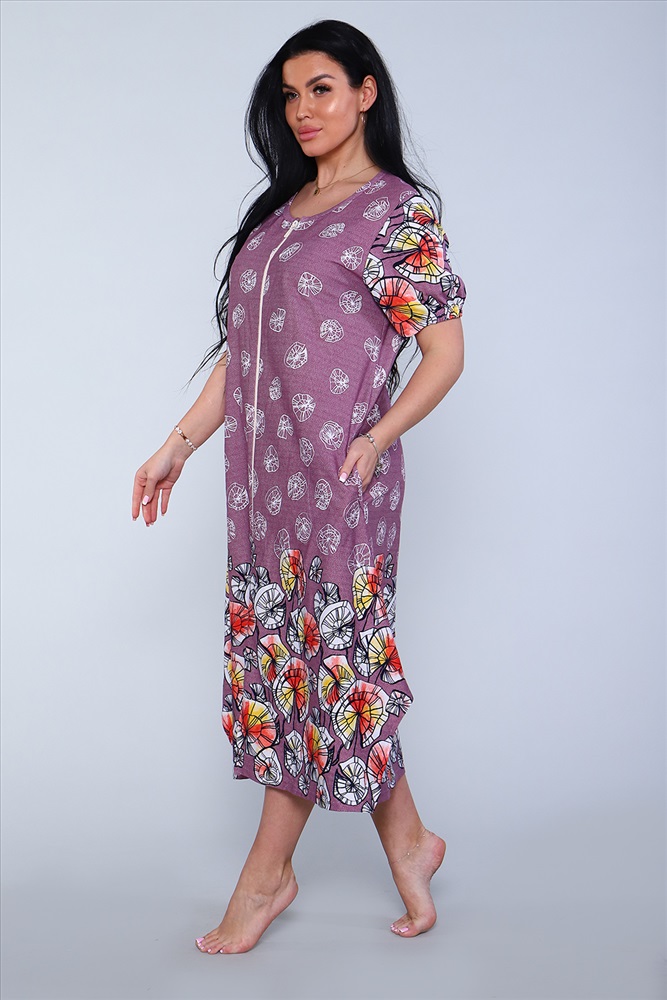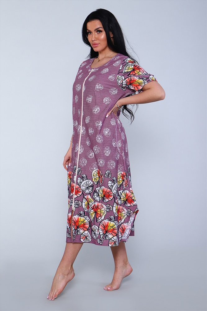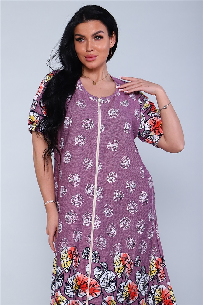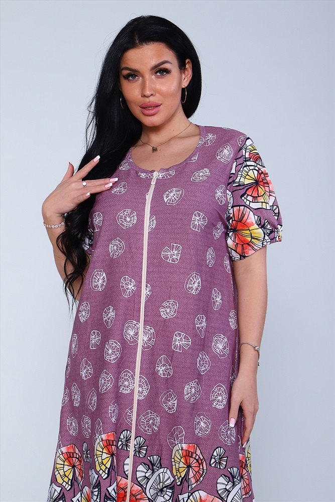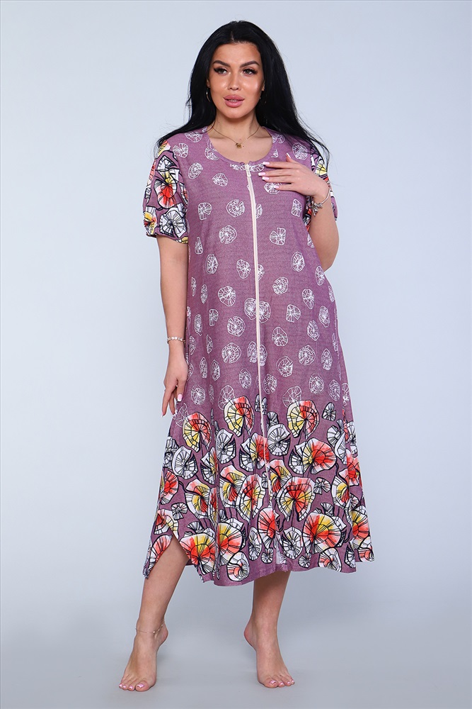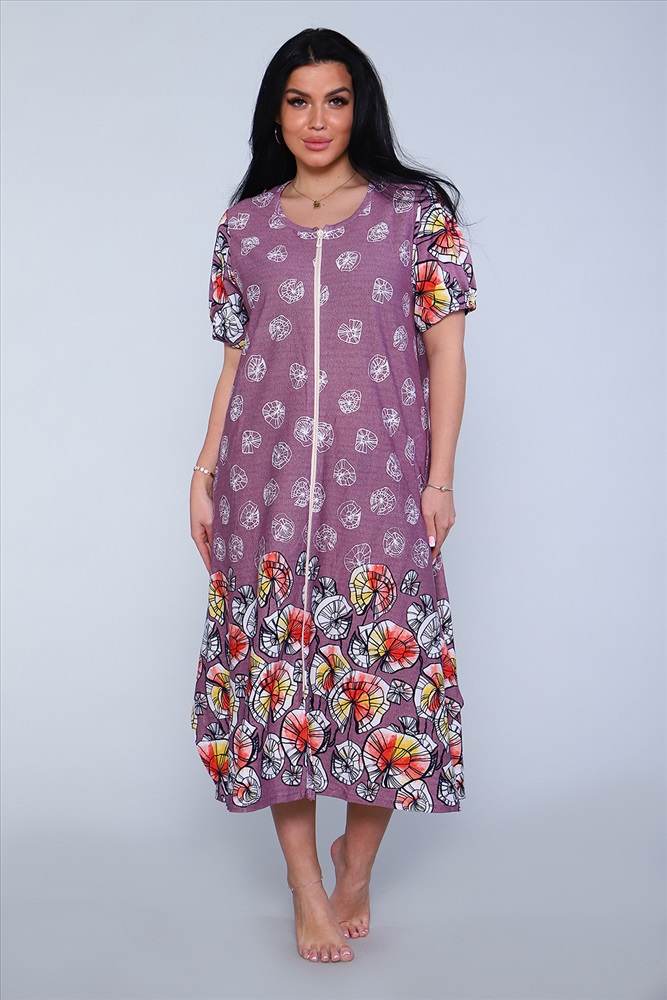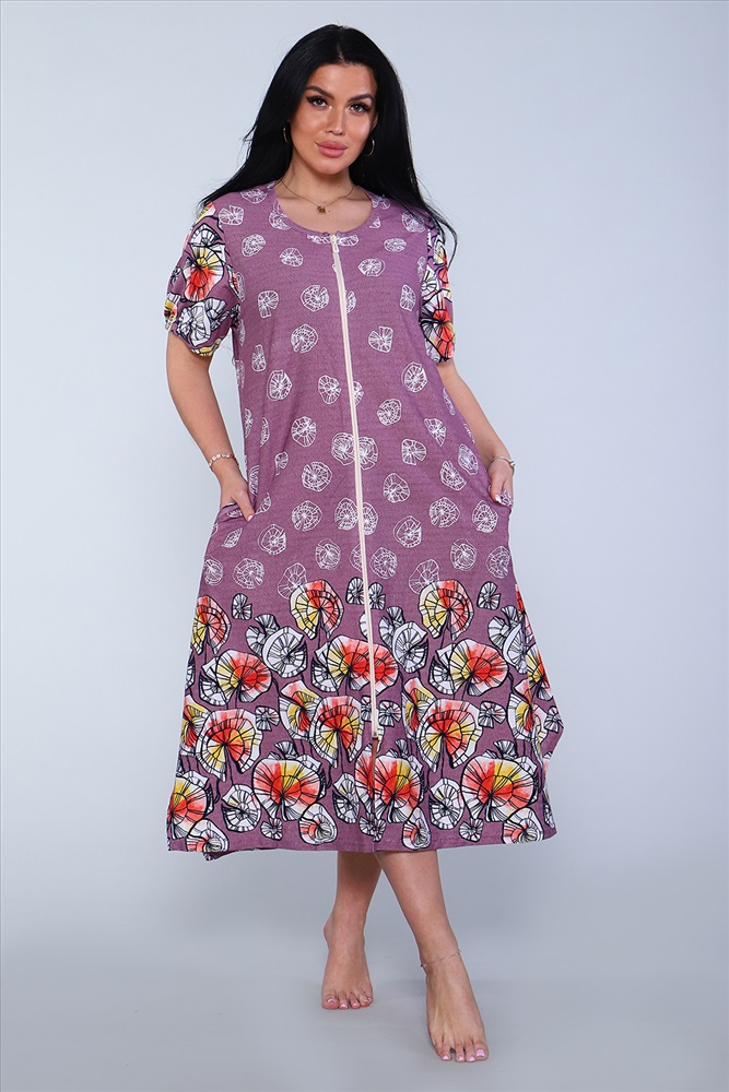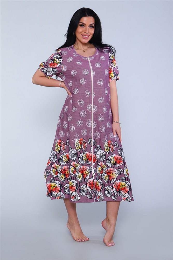 Застежка: молния Халат женский, свободного кроя. На полочке халата в боковых швах расположены карманы. На рукавах посередине низка в подгибке втачена резинка, которая придает небольшую пышность рукаву. Изделие А-образного силуэта с хорошим расширением к низу, отлично садится на женщин с широкими бедрами. Халатик хорошо подходит для дома и отдыха на даче.