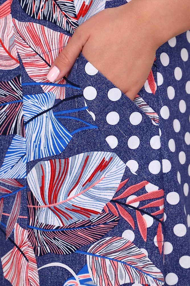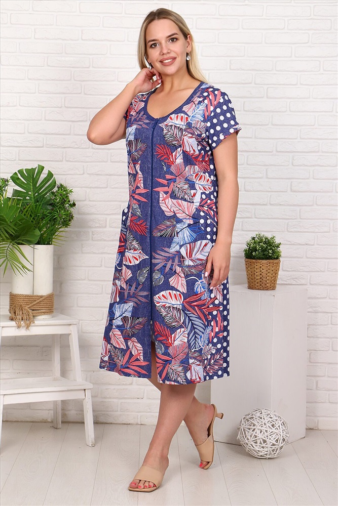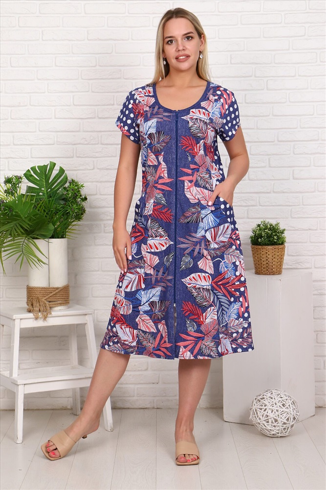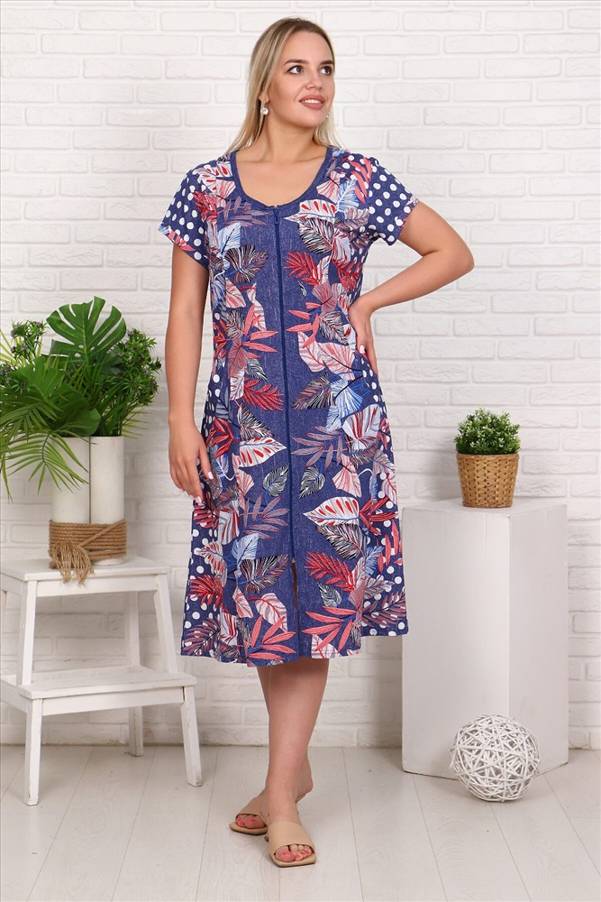 ID товара: 790341 Состав: 100% Хлопок Сезон: Весна/Лето Длина: Ниже колена Фасон: Трапеция Рукав: Короткие Вид застежки: Молния Декоративные элементы: Принт Основная ткань: Хлопок | Кулирка Стиль: Повседневный Страна бренда: Россия Страна производства: Россия Халат домашний женский полуприлегающего силуэта, расклешенный к низу. Для лучшей посадки на фигуру использованы два рельефа, в боковом находится карман. Манжет рукава, горловина и листочка кармана выполнены из ткани-компаньона. Изделие прекрасно смотрится на любой фигуре, отлично подходит для повседневной носки. Комментарии к товару