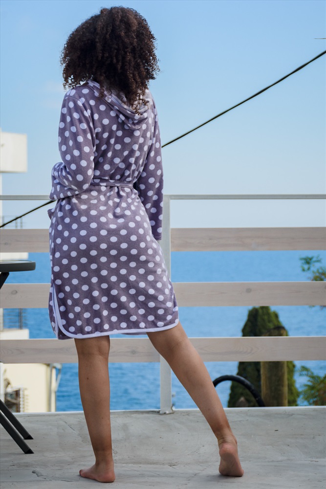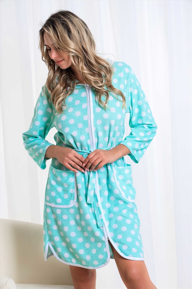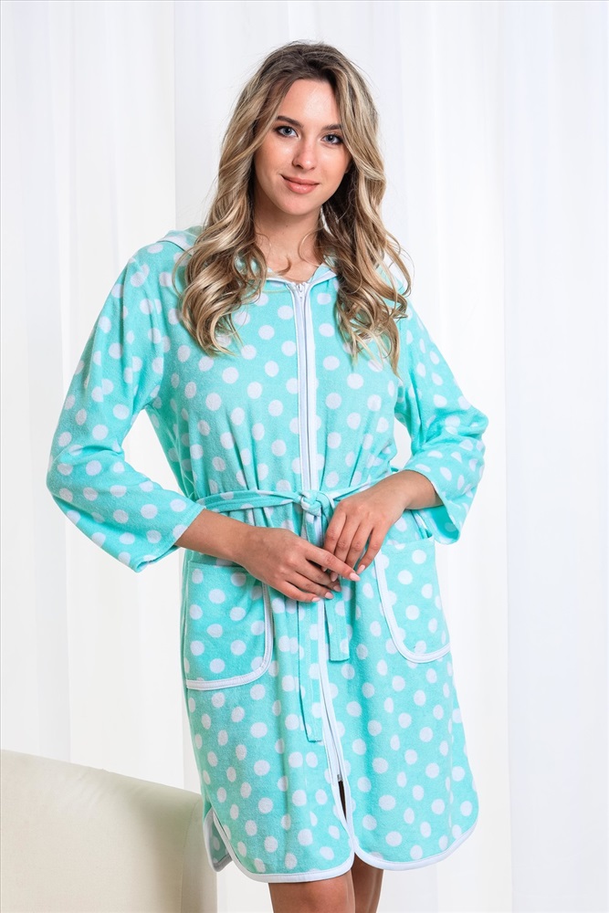 Застежка: молния Удобный женский халат из легкой хлопковой махры. Модель с застежкой на молнии, с капюшоном, двумя карманами по бокам и длинным рукавом