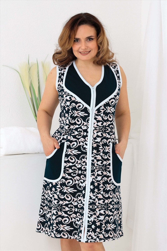 Страна производства: Россия Удобный и практичный халат без рукавов. Застежка на молнию, оригинальный крой полочки. Отлично подходит для лета