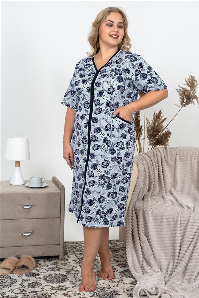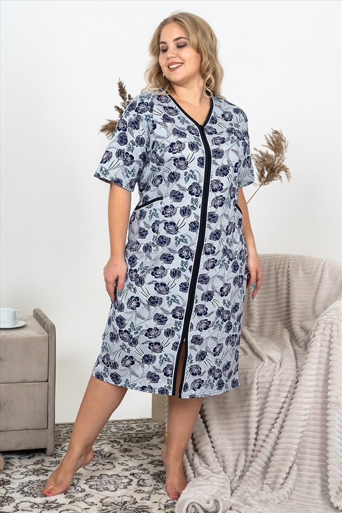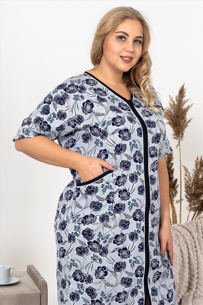 Страна производства: Россия Халат женский домашний изготовлен из кулирки - тонкого и гладкого трикотажного полотна из чистого хлопка. Халат на молнии с боковыми накладными карманами. Рукав короткий. Подойдет женщинам и девушкам с любым типом фигуры.
