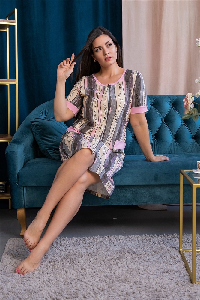 Страна производства: Россия Халат полуприлегающего силуэта на молнии. Короткие рукава с манжетами. Накладные карманы.