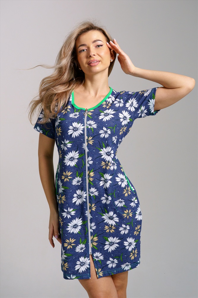 Застежка: молния Женский халатик модной расцветки выполнен из 100% хлопчатобумажной ткани, что обеспечивает максимальный комфорт при ношении. Отличается мягкостью и приятной на ощупь текстурой. Материал прекрасно дышит. Носить такой халатик Вы сможете как летом, так и в любой другой сезон. Надёжный замок на молнии сохраняет свои свойства в течении всего времени использования. Женственный вырез и 2 боковых кармана добавляют образу шарм и делают изделие удобным и практичным. А изысканный поясок подчеркнёт вашу талию. Халатик средней длины подойдёт для любого типа фигуры. Отличная модель для дома, для роддома, после родов, для кухонных дел и хозяйственной уборки, для дачи. И конечно идеально после душа, сауны, бани и ванной. А так же будет замечательным подарком на любой праздник: 14 февраля, день рождения, 8 марта. Рекомендуется стирать в деликатном режиме 30 С. Это поможет избежать деформации и сохранить яркость цвета.