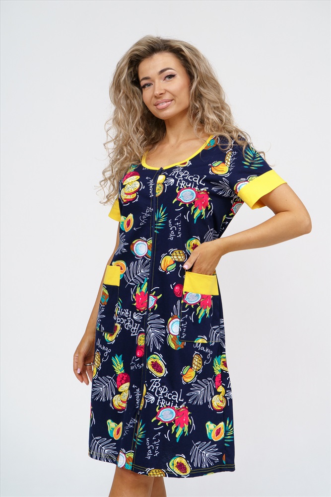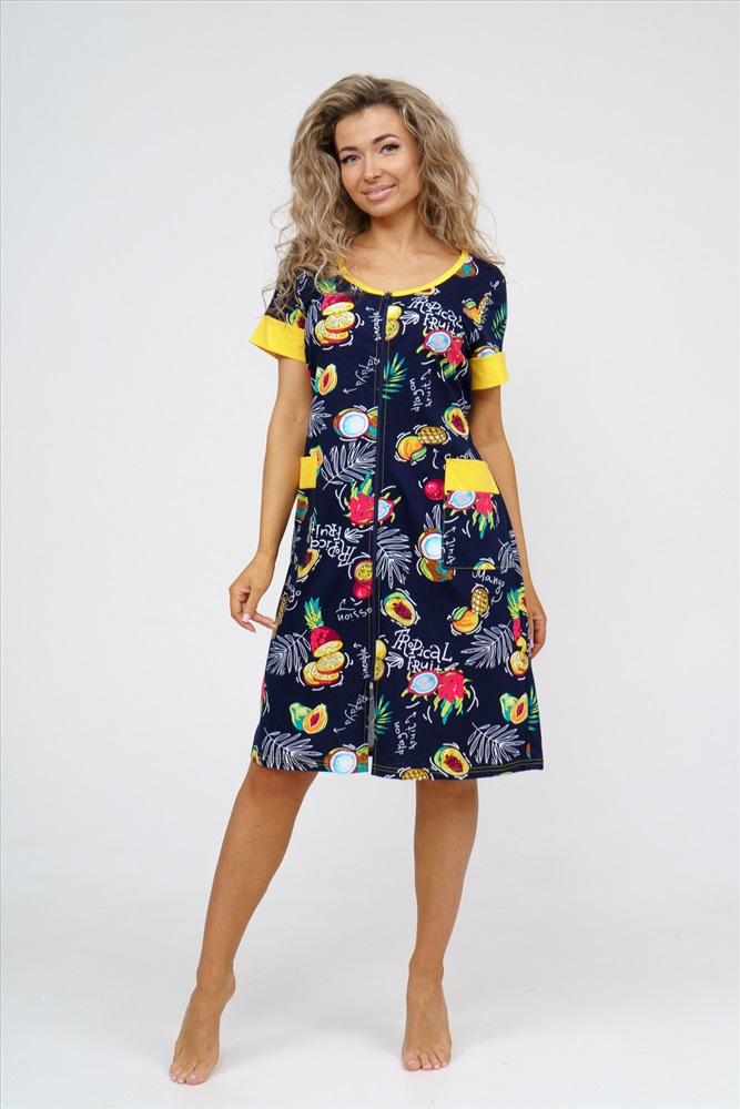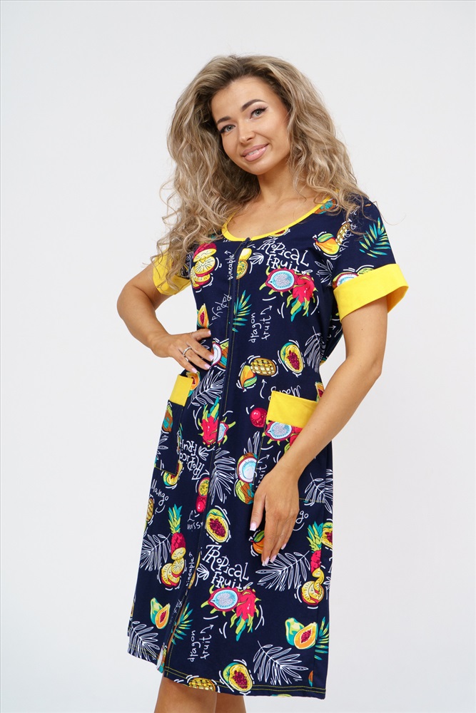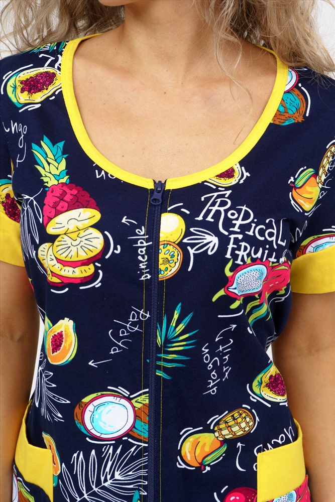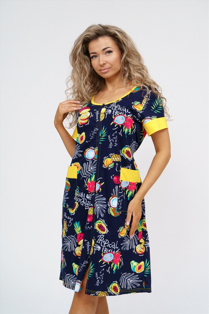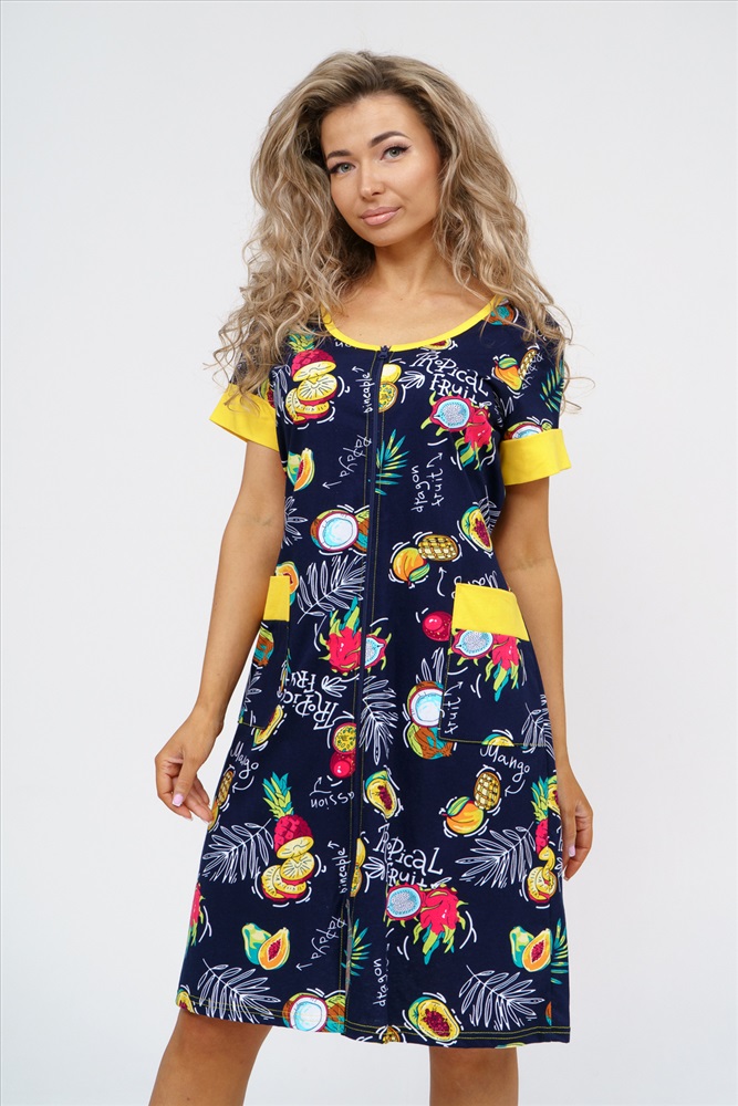 Застежка: молния Женский халатик на молнии самая распространенная и универсальная одежда для домашнего отдыха и хозяйственных хлопот. После трудного рабочего дня, приходя домой, первым делом хочется переодеться. И данная модель это идеальный вариант среди представительниц прекрасной половины человечества. Модель выполнена из 100% хлопчатобумажной ткани. Халат так же дополняет яркая отделка по рукавам и карманам. А пояс на линии талии поможет легко смоделировать женственный силуэт и при этом Вы будете чувствовать себя легко и непринуждённо. Данная модель прекрасно подойдёт для дома, дачи и отдыха, создавая по-настоящему яркий образ и хорошее настроение!