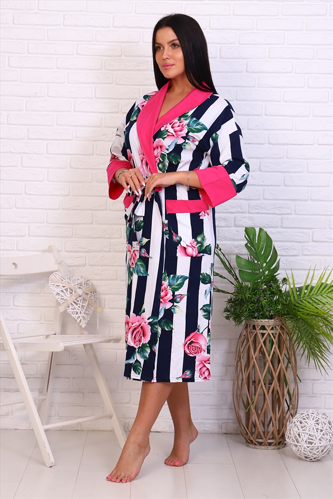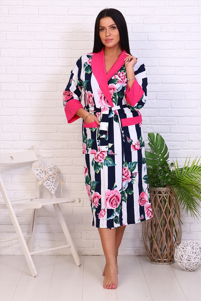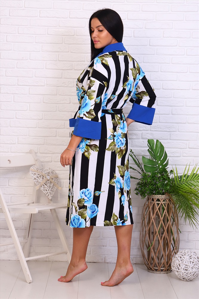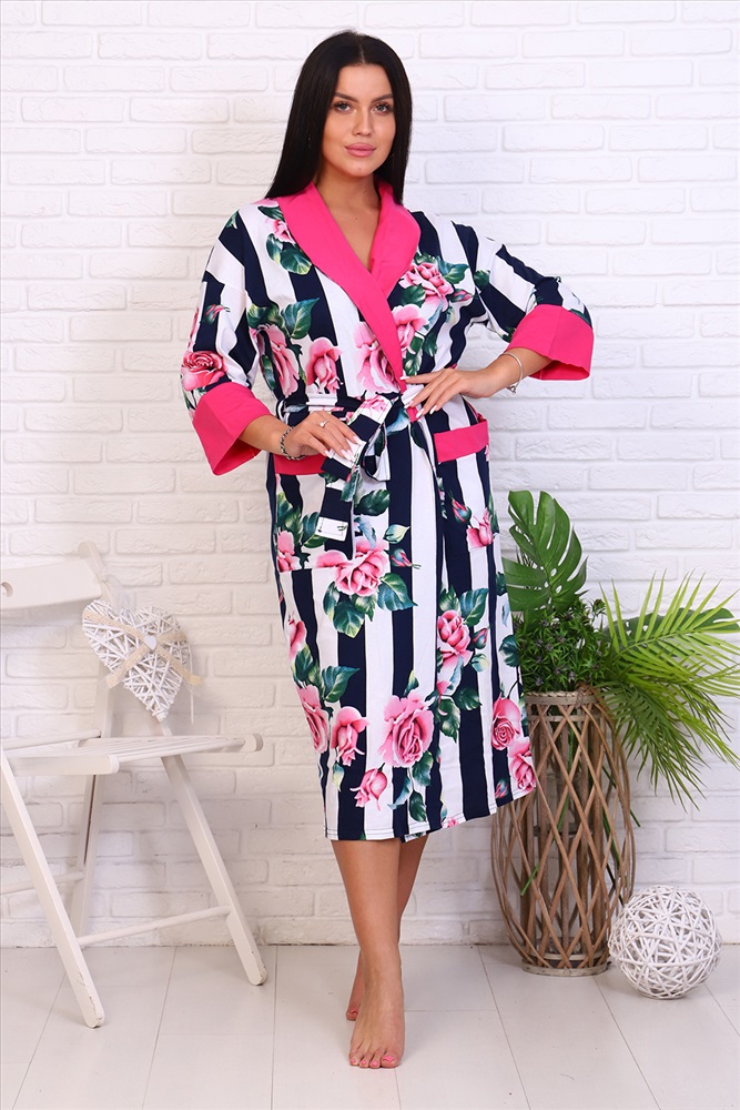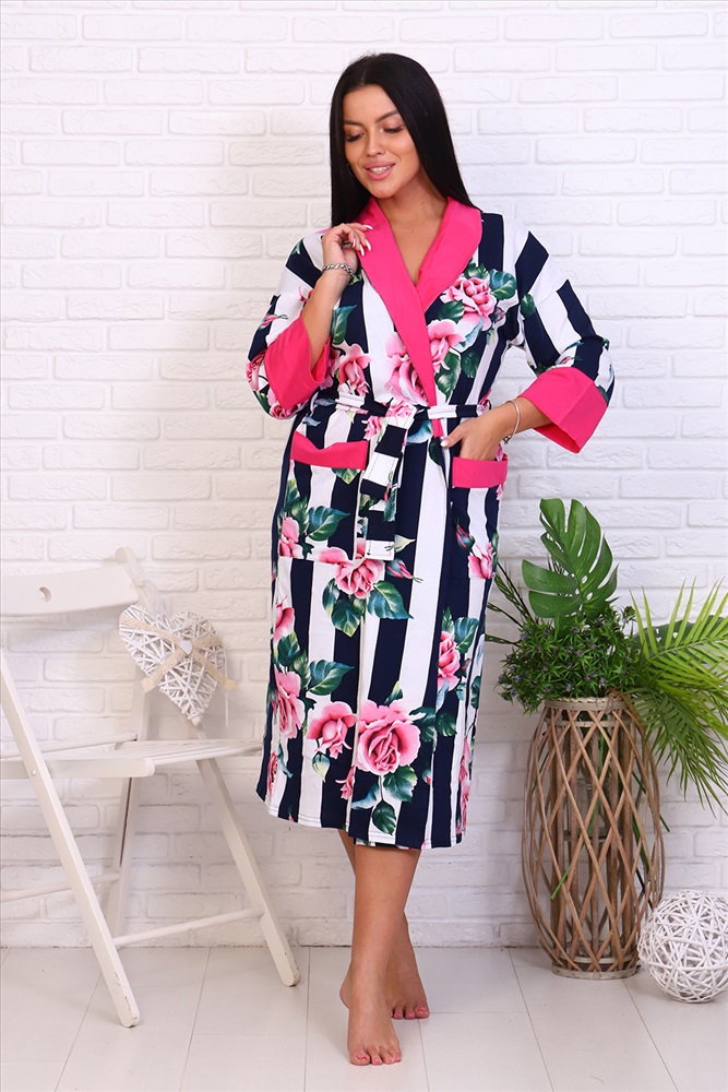 Застежка: на запах | пояс Оригинальный женский халат с красивым принтом на ткани в виде полос и роз. Застегивается на запах с поясом, длина ниже колена