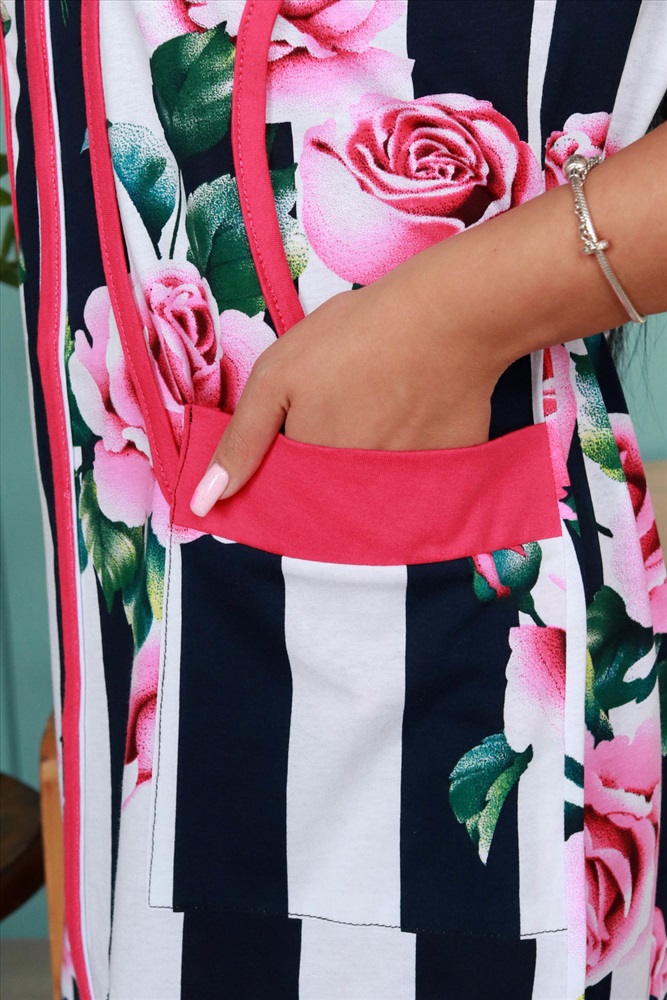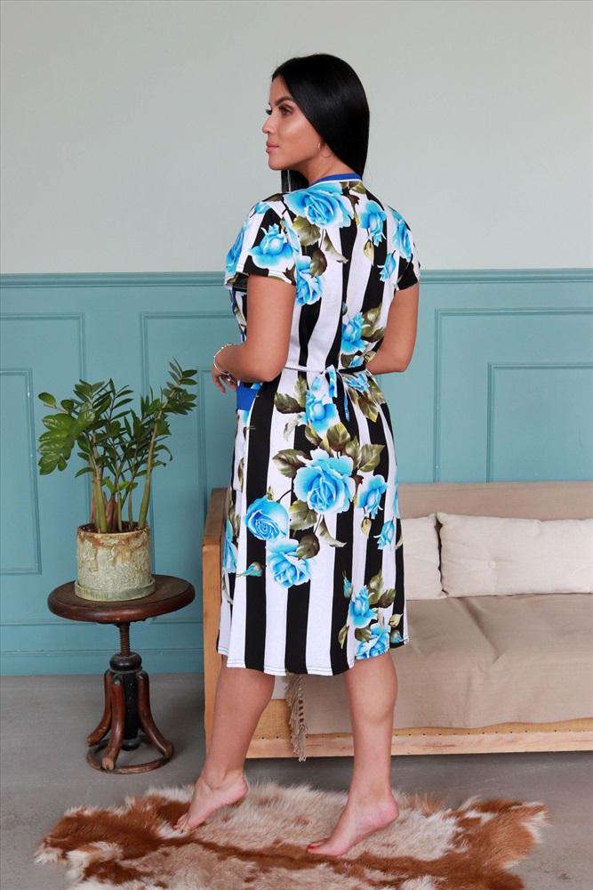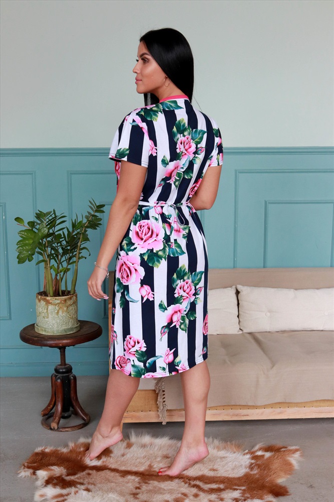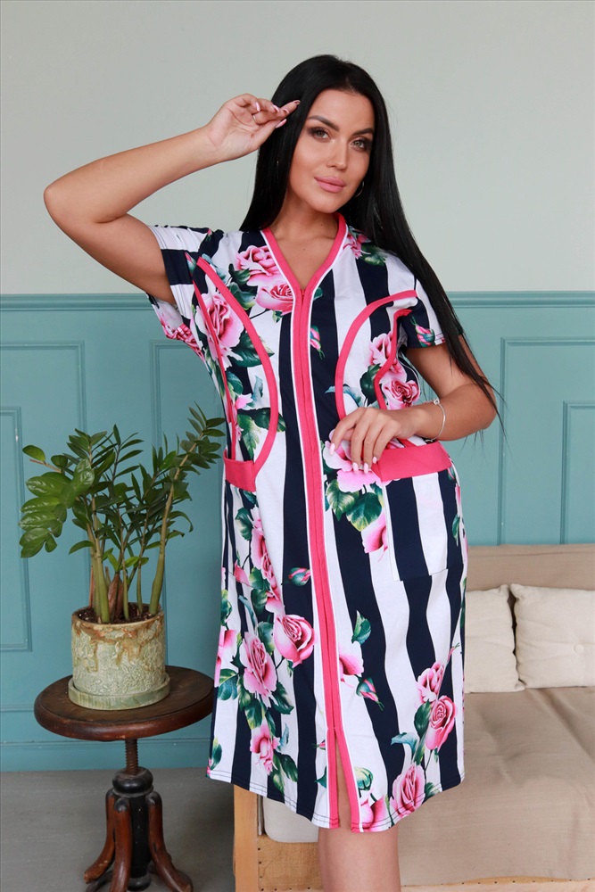 Состав: 100% хлопок Модель: Халат 39013 Тип товара: халат Материал: кулирка | кулирка Бренд: Натали Суслова Длина: средняя длина Карман: на молнии | накладные Назначение: для дома НДС: Без НДС Отделка: с карманами Рисунок: полоска | цветы Рукав: короткий рукав Сезонность: лето | весна Силуэт: полуприлегающий Стиль: домашний Воротник: без воротника Женский халат средней длины на молнии, с красивым принтом на ткани в виде полос и роз. Общая длина приблизительно до коленей. Таблица размеров и веса